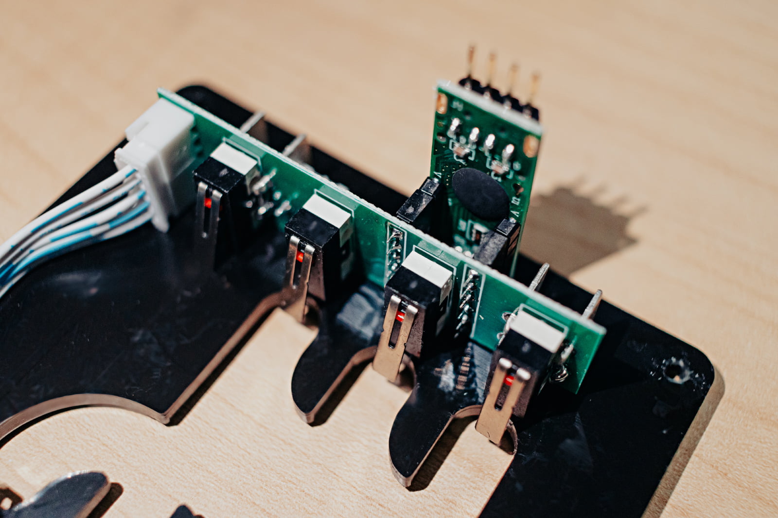 Qua elektronica zit de H-Shifter net zo simpel en functioneel in elkaar als de behuizing en het mechanische gedeelte. Aan het uiteinde van elke versnellingsgleuf zit een standaard microswitch welke ingedrukt wordt door de schacht van de versnellingspook, deze microswitches kun je van buitenaf zien zitten. Met twee PCB’s staan alle switches met elkaar in verbinding en een derde PCB geeft de data middels een 4-pin connector weer door. De PCB’s en de microswitches zitten vast aan de bovenzijde van de shifter welke je kunt verwijderen en binnenin zit de 4-pin connector female welke de output naar de USB-kabel stuurt. Deze verbinding maakt het loshalen en weer monteren van de bovenplaat inclusief microswitches en PCB’s een eitje.