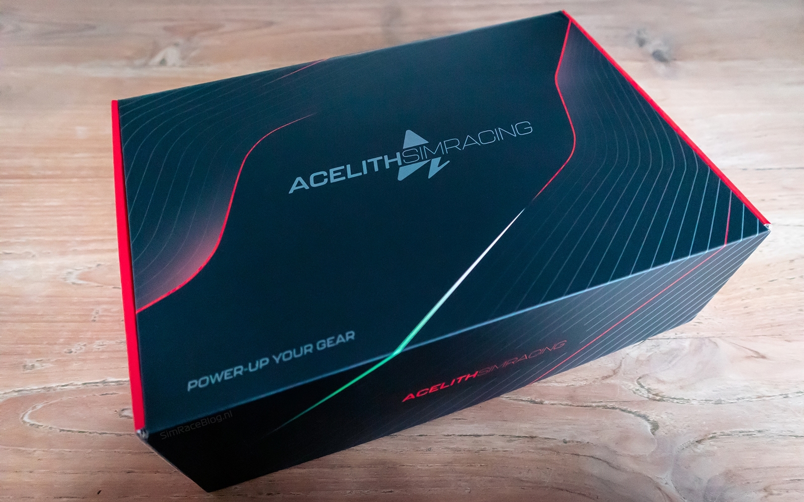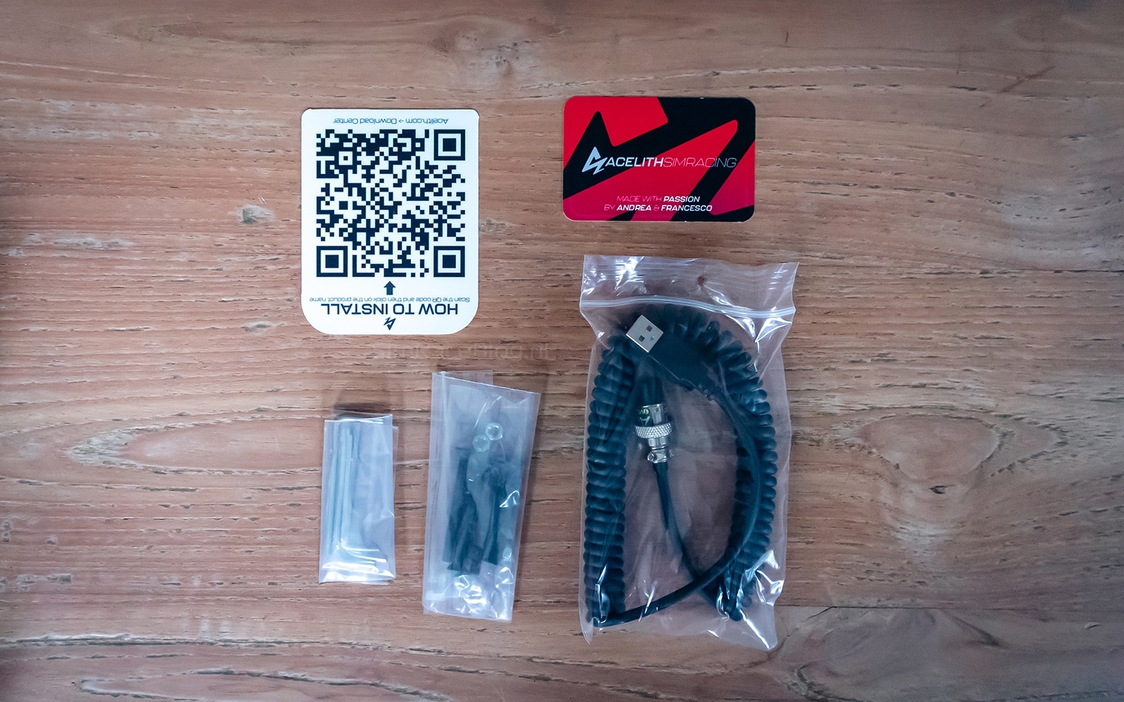 De productdoos zelf is een stijlvolle zwarte doos met rode accenten en het Acelith Simracing-logo erop. Bij het openen van de doos vinden we direct een schuimlaag met daarop een vel stickers. Onder deze schuimlaag ligt het stuurwiel, samen met twee verschillende lengtes boutjes, moertjes, inbussleuteltjes en een gekrulde USB-kabel. Daarnaast bevat de doos een visitekaartje en een witte kaart met een QR-code die verwijst naar de online handleiding.
