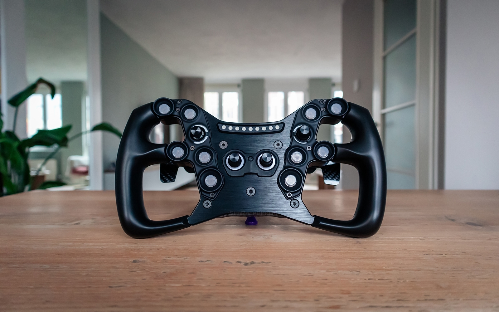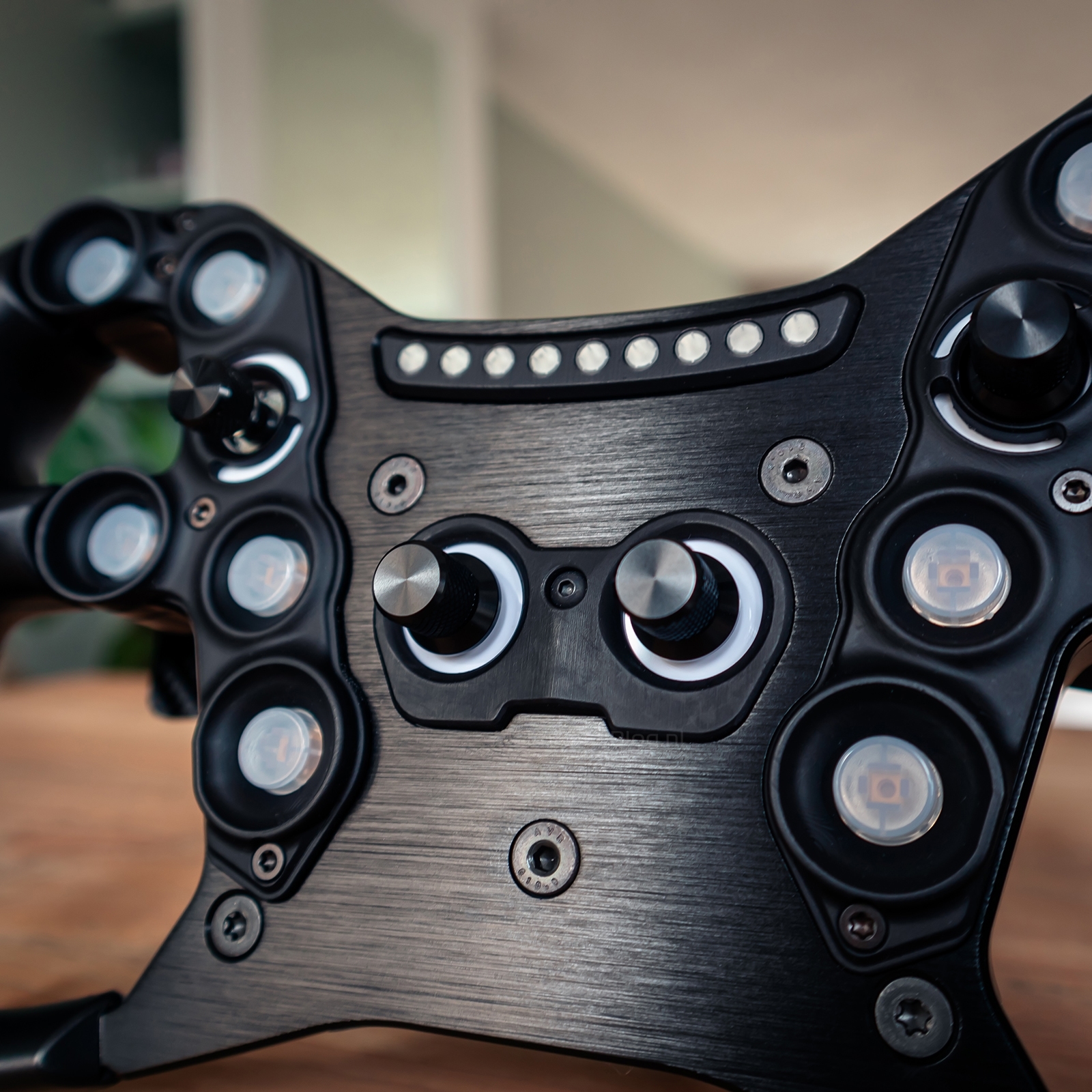 Aan de voorkant van de GT-Phenom zien wij tien drukknoppen, gelijk verdeeld met vijf aan elke kant. Rondom een aantal van deze knoppen zijn zogenoemde buttonguards geplaatst om te voorkomen dat ze per ongeluk worden ingedrukt. Aan de linkerkant zien wij tussen de knoppen een multi-directionele joystick (7-way funky switch), terwijl we aan de rechterkant op dezelfde positie een roterende encoder vinden. In het hart van het stuur zitten daarnaast nog twee extra roterende encoders. Bovenaan de GT-Phenom zien wij negen LEDs die kunnen fungeren als RPM- of telemetrie-LED’s. In totaal zijn er 33 LEDs aan de voorkant aanwezig, die volledig aanpasbaar zijn via SimHub.