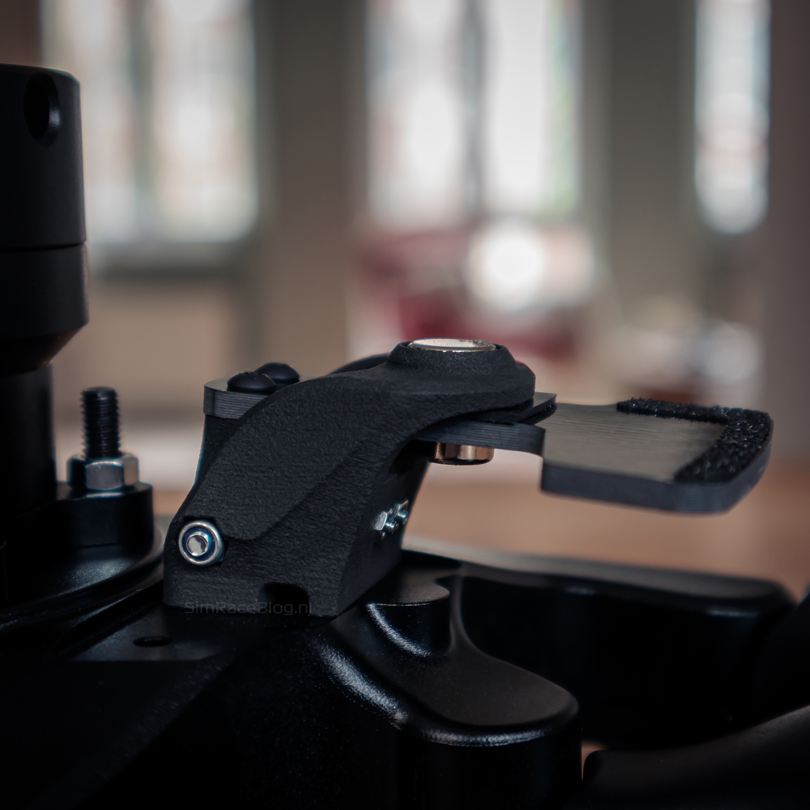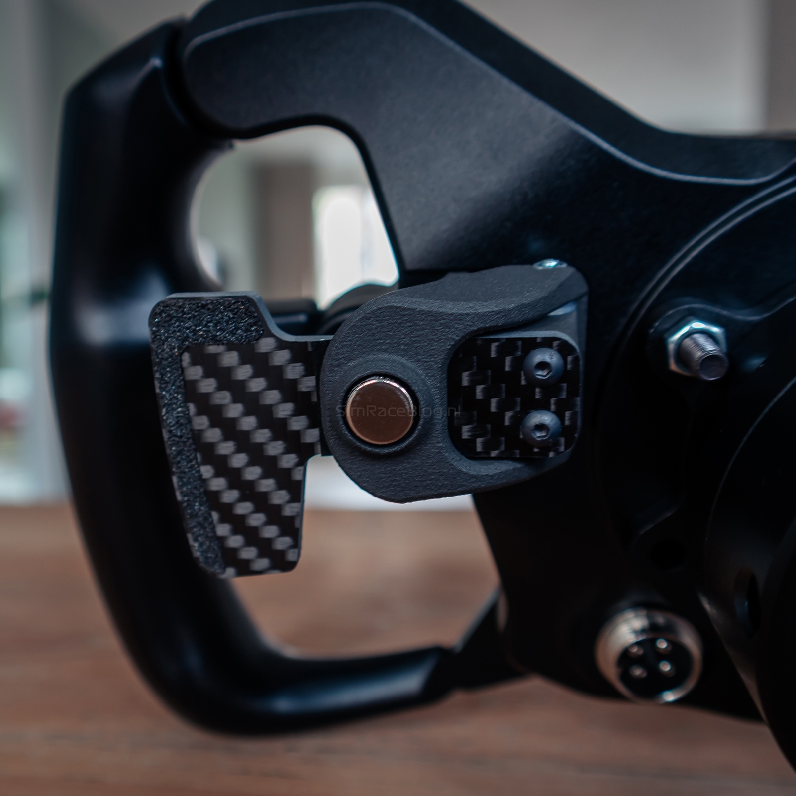 Aan de achterkant van het stuurwiel vinden we aan beide zijden een magnetische schakelmodule. Deze modules zijn vervaardigd uit stevig MJF-geprint materiaal en voorzien van een carbon paddle. Voor extra grip is op de paddles een klein stukje schuurpapierachtig materiaal aangebracht. Volgens Acelith Design zijn de schakelmodules vervangbaar door alternatieven van third-party leveranciers. In het hart van de GT-Phenom bevindt zich een 70 mm boutenpatroon, waarop we onze Simucube Quick-Release kunnen monteren. Daarnaast is hier ook de aansluiting voor de USB-kabel te vinden.