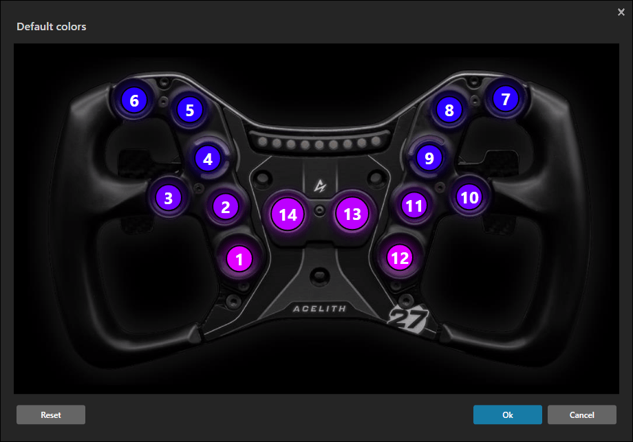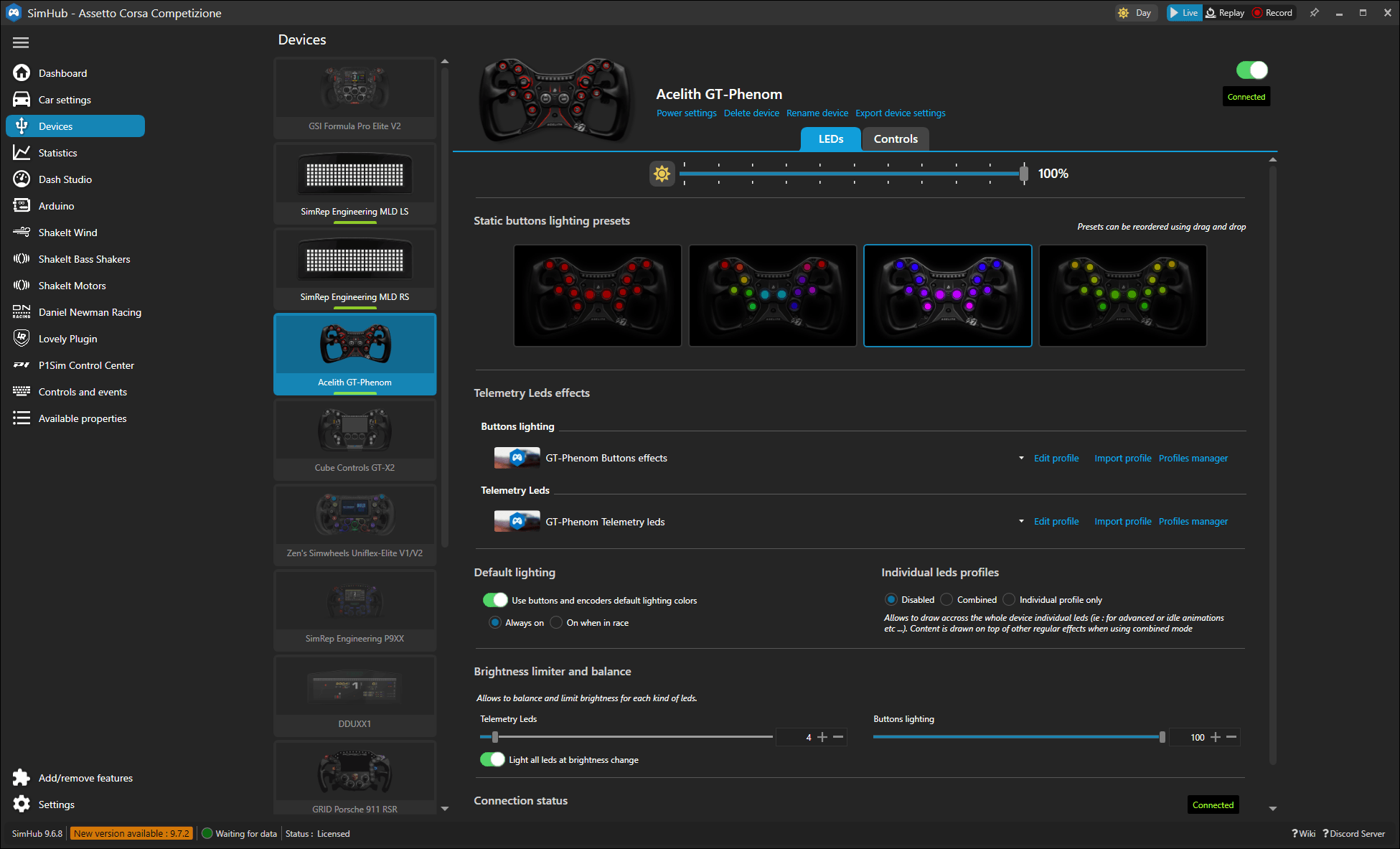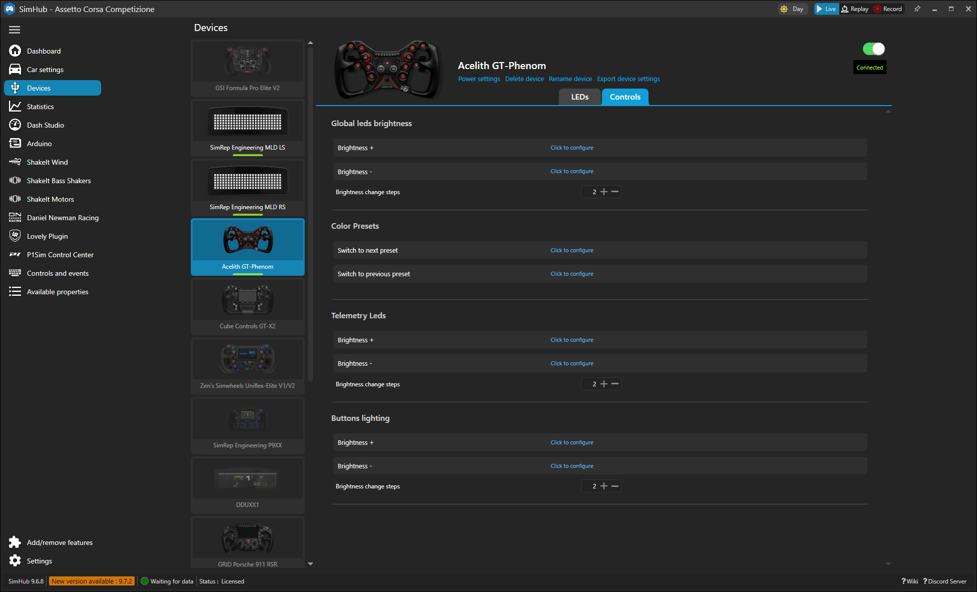 Het stuurwiel kan gebruikt worden in combinatie met SimHub. Dit is nodig om de LEDs te configureren en de telemetriefunctionaliteiten in te stellen. Acelith is als fabrikant al voorgeprogrammeerd in SimHub, wat betekent dat we het stuurwiel met slechts enkele klikken kunnen toevoegen. Door het merk Acelith en het model GT-Phenom te selecteren en op ‘Ok’ te klikken, wordt het stuurwiel direct toegevoegd. Hierdoor werken alle basisfunctionaliteiten en worden er automatisch twee standaardprofielen aangemaakt: één voor de buttons en één voor de telemetrie-LEDs.