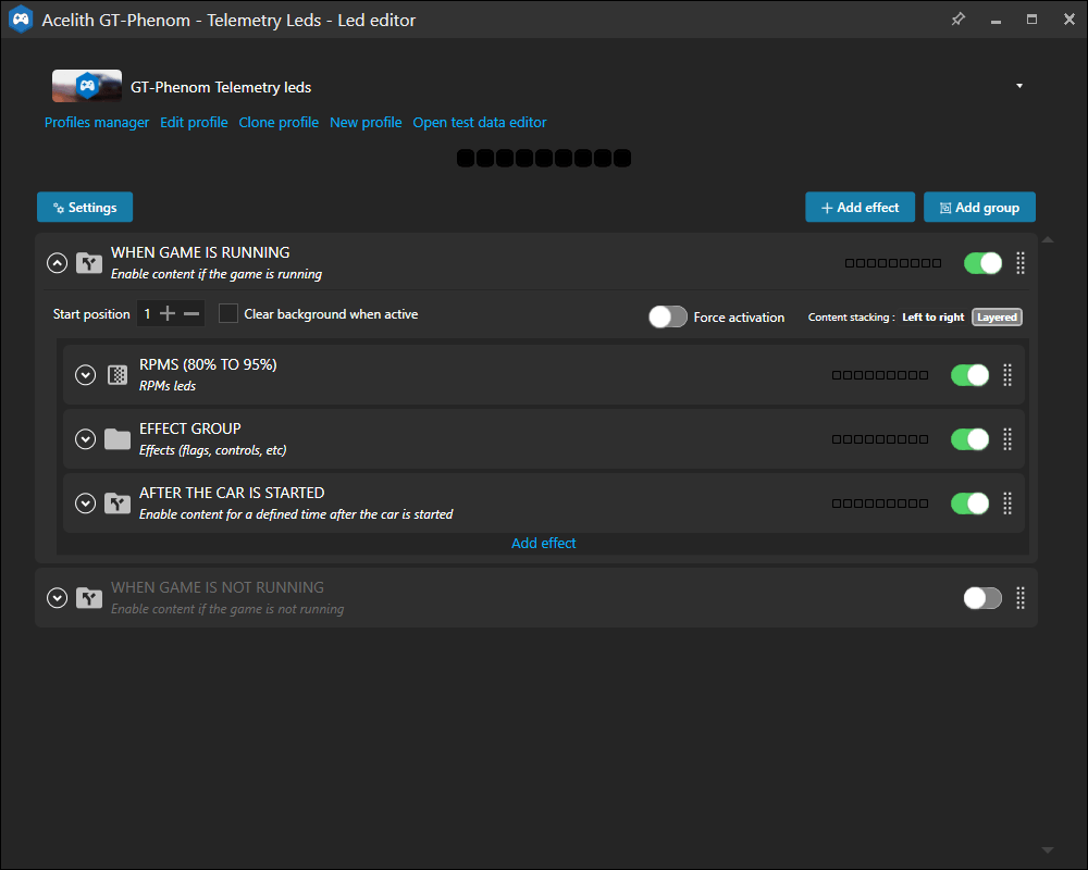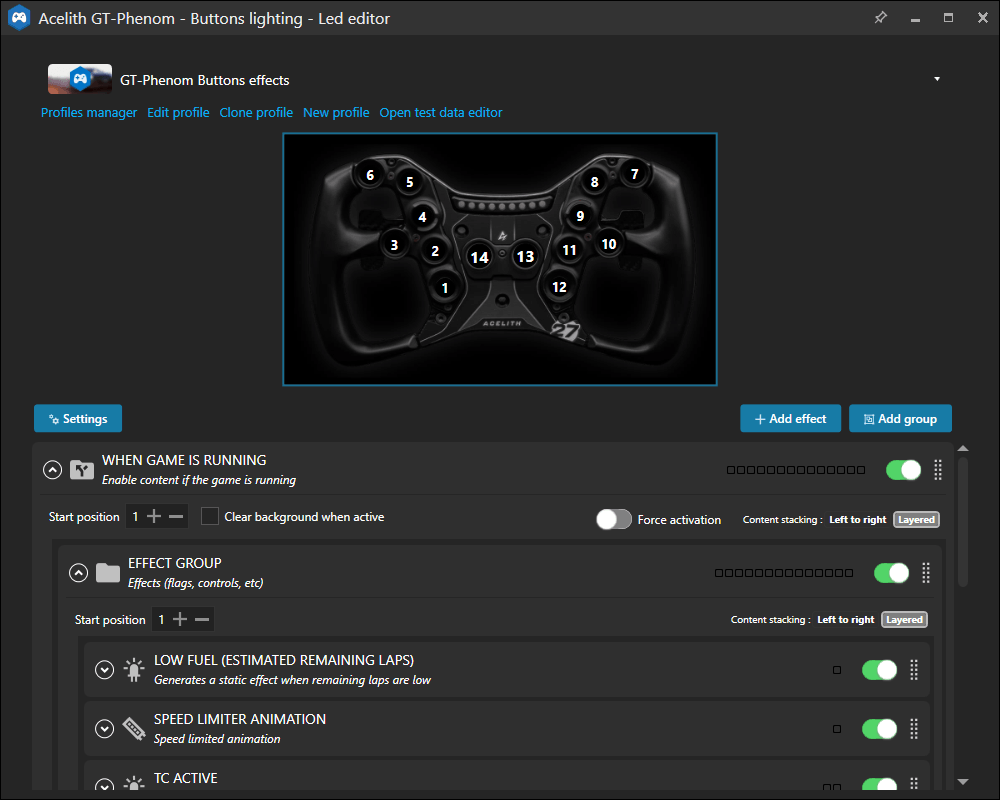 In SimHub kunnen we deze profielen vervolgens naar eigen wens aanpassen. Denk hierbij aan het instellen van de LED-kleuren voor de buttons, verschillende telemetrie-effecten en functies. De standaardprofielen voldoen echter prima, waardoor we enkel de LEDs van de buttons naar onze eigen voorkeur aanpassen. Wel merken we hierbij op dat er sprake is van veel backlight-bleeding op de LEDs. Dit houdt in dat de kleur die we voor een specifieke button selecteren ook enigszins doorvloeit naar de omliggende buttons, wat invloed heeft op het uiteindelijke kleurgebruik. Om dit effect te minimaliseren, maken we gebruik van kleuren die dicht bij elkaar liggen in het kleurenspectrum, zodat het doorvloeien minder opvalt en het visuele geheel rustiger oogt.
