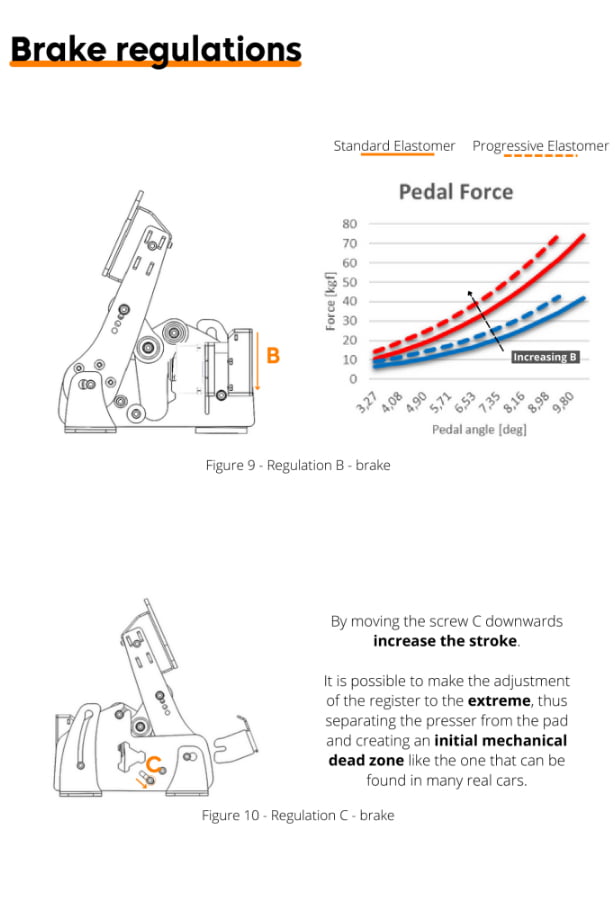 The brake pedal is not equipped with the CBF system, but a one elastomer based system developed by 3Drap. The elastomer is located together with the load cell sensor in a 3d printed housing that is adjustable in height. Resting against the elastomer is an arm which is attached to the front of the brake pedal and which exerts pressure on the elastomer. Lowering the housing with the load cell sensor and the elastomer makes the brake pedal heavier, moving it upwards makes the pedal lighter. The preload of the brake pedal can be adjusted by pushing the arm further towards the elastomer using with the shaft that pushes against it. Doing this means that the elastomer is already slightly pressed, which also ensures that the stroke on the pedal is reduced. Finally, the angle of the pedal can be slightly adjusted in four positions at the front of the pedal, but this is somewhat superfluous to us since all three pedals allow the angle of the pedal to be adjusted at the rear.