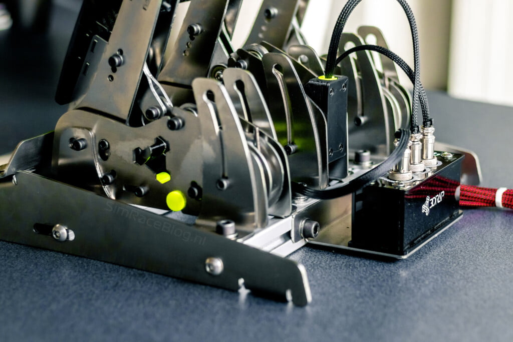 The throttle and clutch pedals are both equipped with a magnetic Hall Effect sensor, which ensures frictionless and resistance-free registration of the position of the pedal. The brake pedal is, as we often see, equipped with a load cell sensor. The throttle and clutch pedals have a resolution of 12bit, while the brake pedal with the load cell sensor has a resolution of 16bit, which means that the input value of the pedals can be displayed in 4096 and 65536 steps respectively.