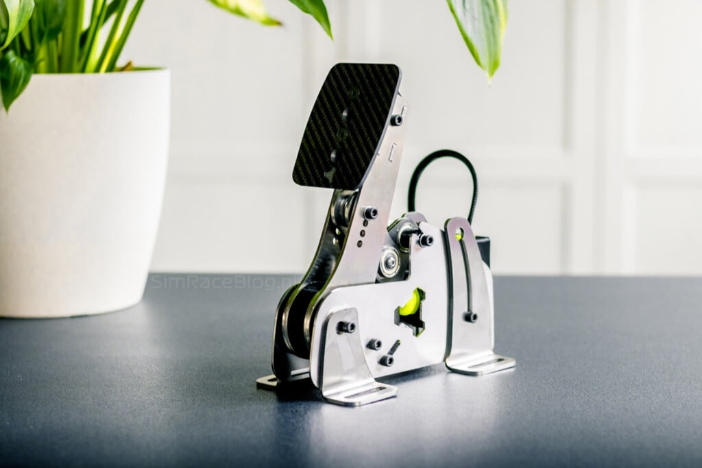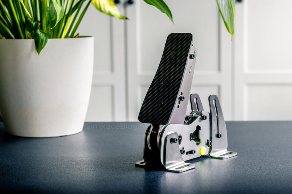 At least as interesting as the throttle pedal is the brake pedal. Out of the box, with the default setting, it already has a characteristic feel that we have to get used to at first. Because there is some space between the arm and the elastomer against which it presses, a clear empty space can be felt at the first millimeters of stroke of the brake pedal. This simulates the space between the brake pads and the brake disc. With the default setting, the brake pedal then turns quite hard with minimal travel still present. We are used to the brake pedal quite quickly and do not take that long to find our normal braking points.