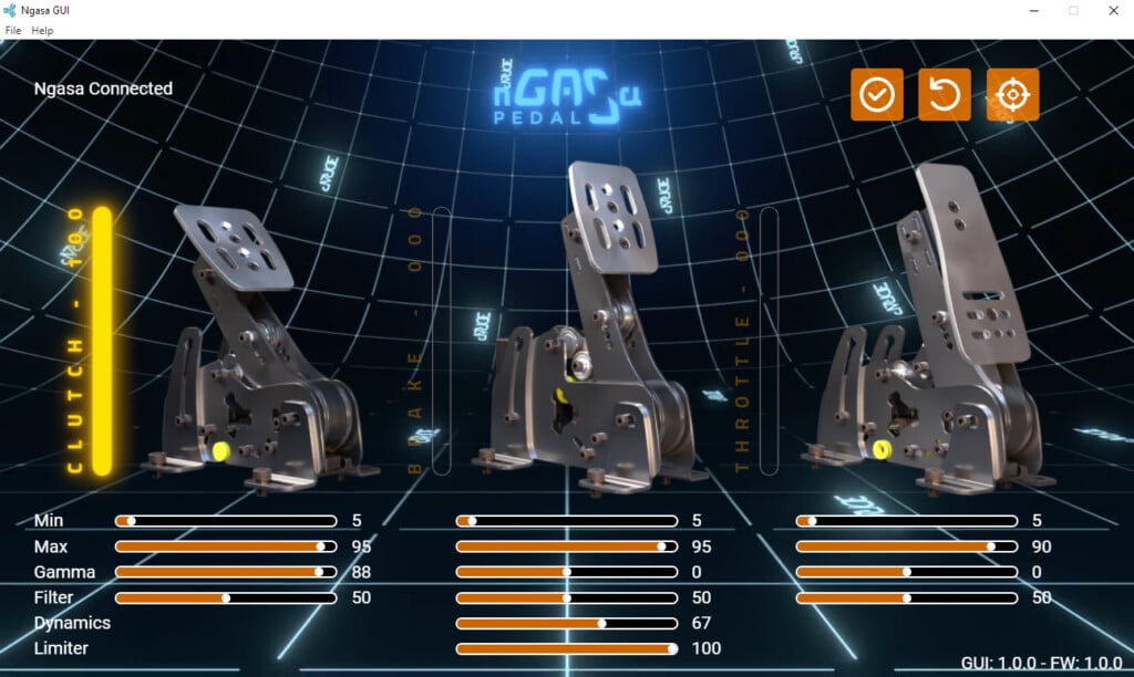 In addition to the aforementioned sliders, the software also has three buttons at the top right of the screen. From left to right, this allows you to apply the current setting, restore default settings, and recalibrate the pedals. Noteworthy about the 3drap Ngasa pedals and software is that this is a self-calibrating system. When the pedals start up, they are automatically calibrated after having been pressed once, so that you do not have to perform your own calibration for every change. The calibration button is mainly intended to force a recalibration when you have made an adjustment to, for example, the travel of a pedal during use and do not have the time to reconnect the pedals and have them recalibrated.