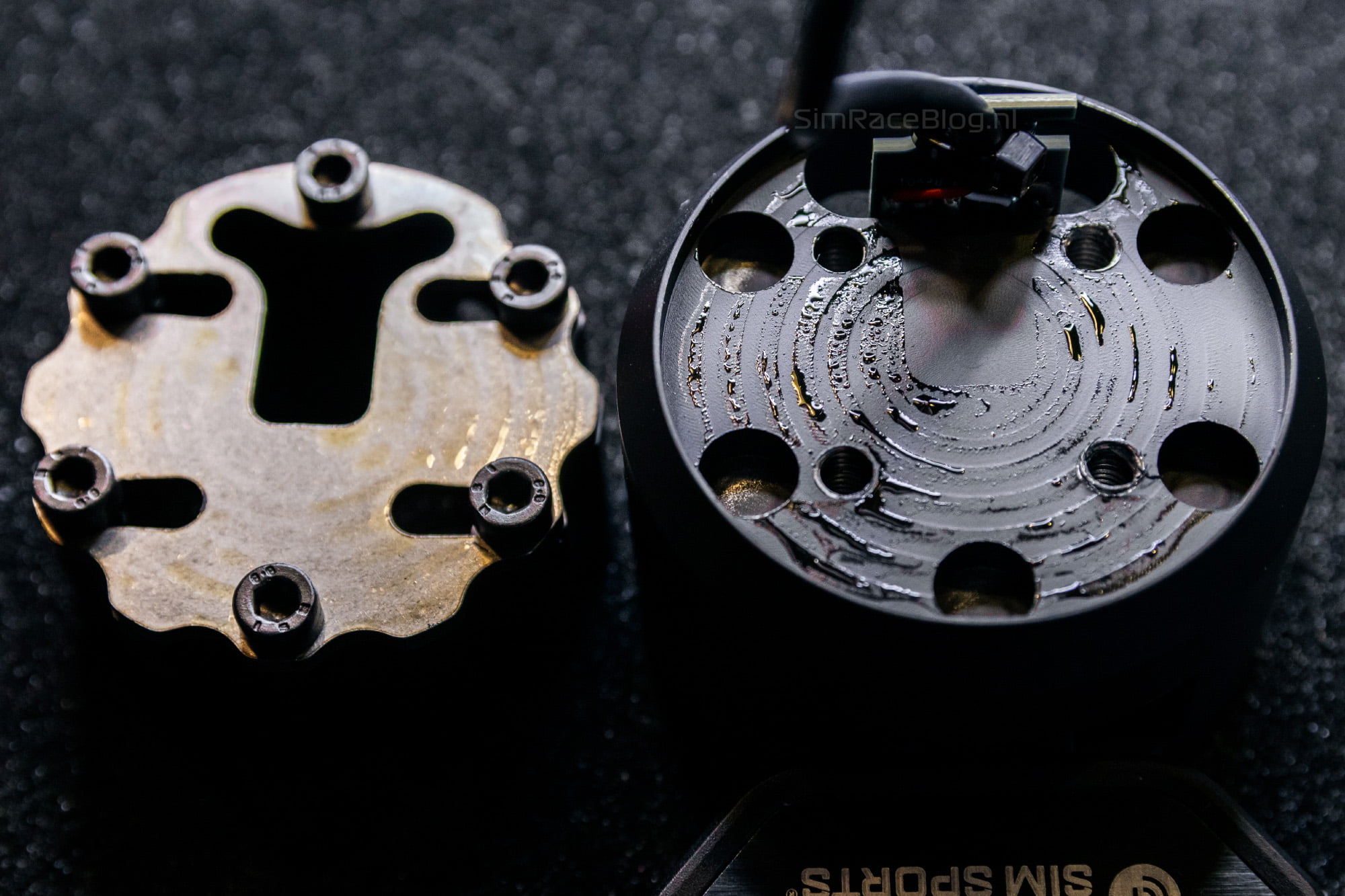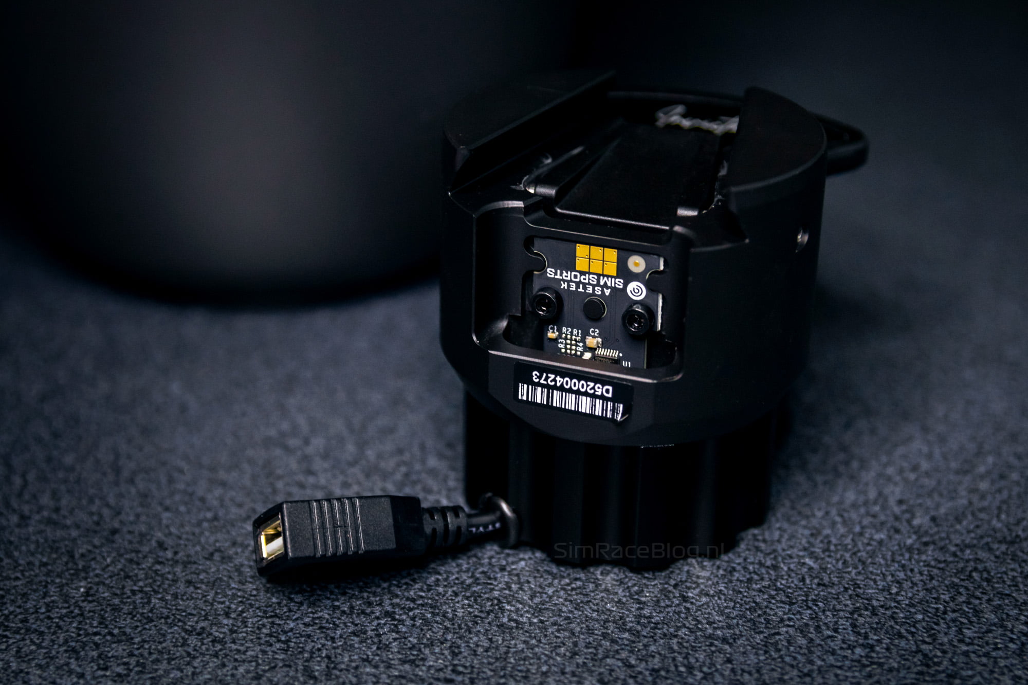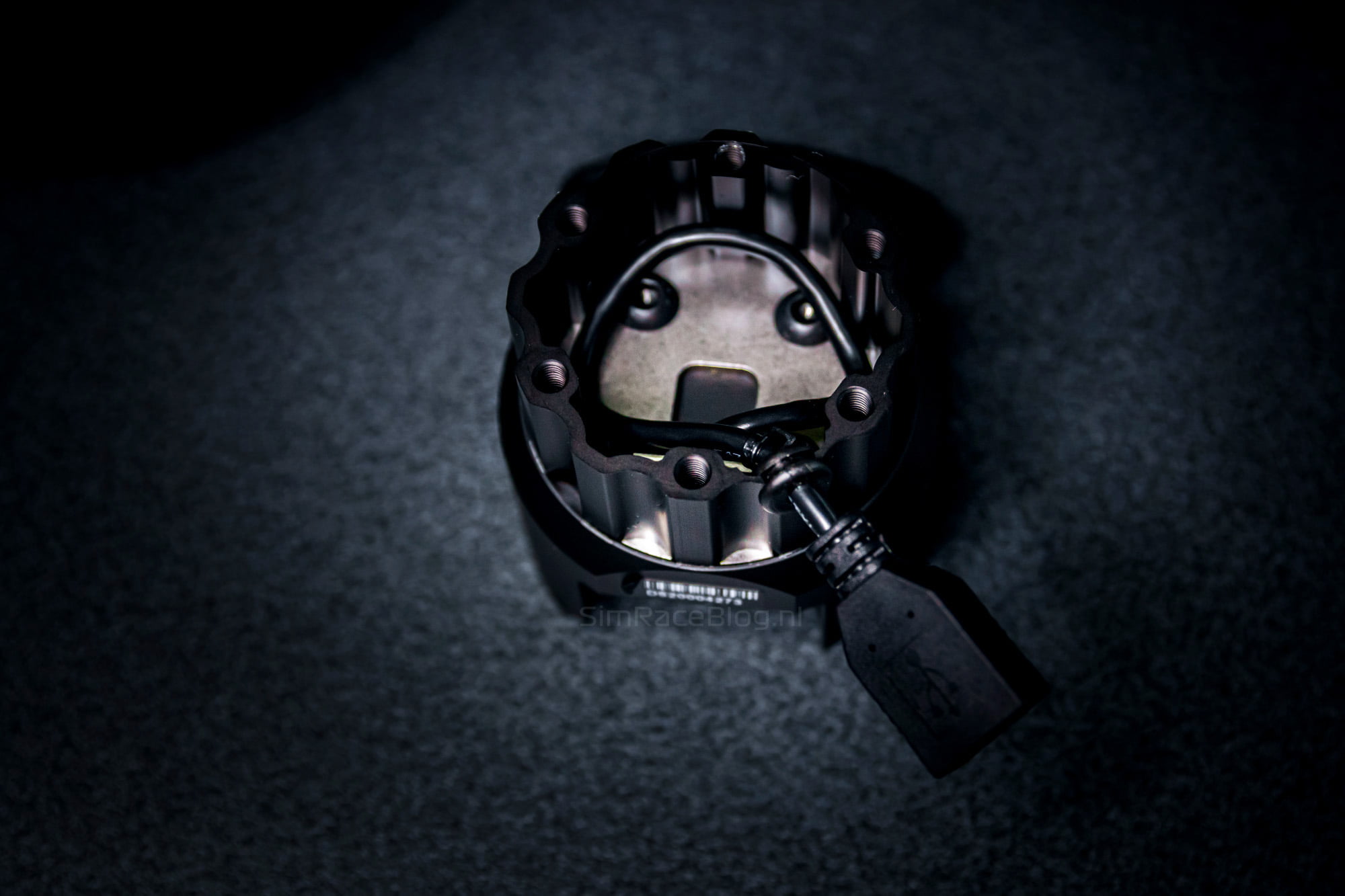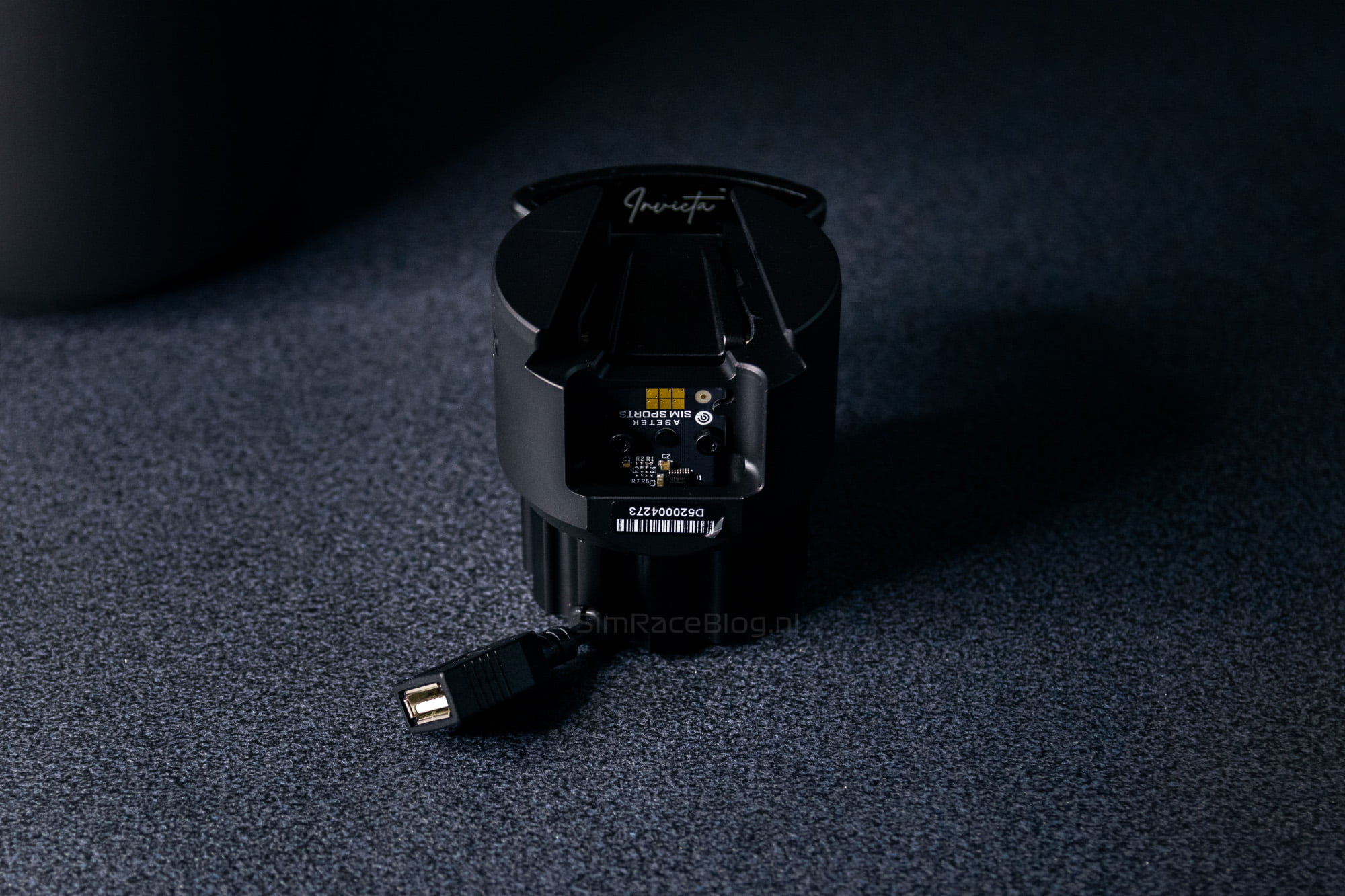 The Asetek Invicta Quick Release Adapter, on the other hand, is entirely crafted from black anodized and CNC-machined aluminum, providing a high-end look and a sturdy feel in hand. Visible on the Quick Release Adapter is the lever for detaching the steering wheel from the wheelbase, featuring the stylish ‘Invicta’ signature on the rear and the Asetek SimSports logo on the front. Inside the Invicta Quick Release Adapter, there’s a circuit board that establishes a connection with the Asetek wheelbase, utilizing a wireless USB connection on the wheelbase side. Connected to this circuit board is a female USB plug, with its cable mostly concealed within the internals of the Quick Release Adapter. The USB cable of a third-party steering wheel can then be plugged into this female USB plug, providing power to the wheel and handling the data transfer from the steering wheel to the PC. Essentially, this means that the Asetek wheelbase and Invicta Quick Release Adapter act as a direct USB port for a third-party steering wheel.