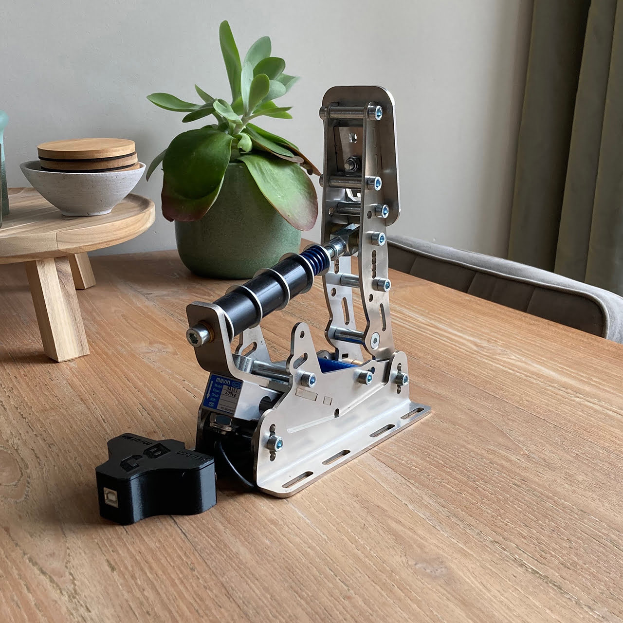A frictionless magnetic hall sensor system is used for both the clutch and accelerator pedal. In the brake we find a 200kg load cell module which is placed at an angle of 45 degrees. A fairly striking, but simple construction. All this is controlled by a 16-bit Leobodnar Loadcell USB board which is neatly concealed in a plastic 3d printed housing. Because this housing hangs loose, and it is probably the intention to mount it on your rig, we have drawn a simple holder and printed it in 3d so that it can be mounted as one beautiful whole on the pedal plate. We can set and calibrate the pedals with the manual, the Leobodnar LC-USB tool and the Leobodnar DiView software.