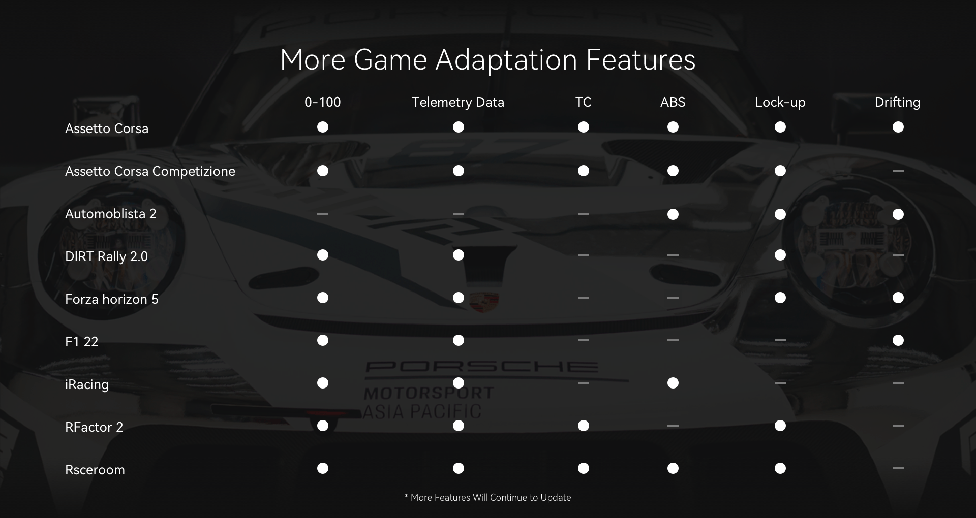 The Conspit CPP.Lite pedals are all equipped with their own M-DVF haptic feedback motor. As described in the “Software” section earlier, we can only choose the effect on which the motors vibrate, we cannot further adjust the strength or vibration frequency. The vibrating of the clutch pedal is controlled via Conspit Link; it always vibrates within the set range in the Launch Control setting. For the other effects, such as vibrating based on Traction Control or ABS, we notice that they don’t work when we start Assetto Corsa via Content Manager, just like the 0-100km/h plug-in. When we start Assetto Corsa directly from Steam, the vibration motors work. We find that the pedals give a pleasant vibration that is well felt under the foot, but the effect is not very strong. Especially with the ABS effect, the brake pedal could have been more intense when the system activates for a bit more immersion. That being said, we consider the vibration motors a valuable addition, and we notice that it’s easy to modulate the braking when we feel the ABS system kicking in or when our wheels lock up. In Assetto Corsa Competizione, the effects work directly. Conspit has the following image available on their website to show which effects are supported by which game.