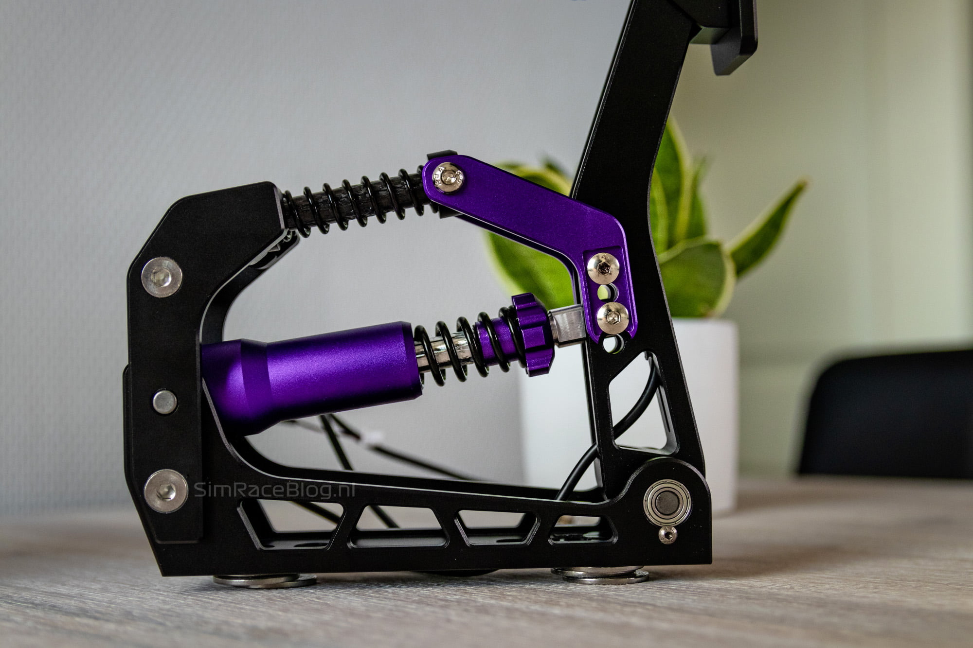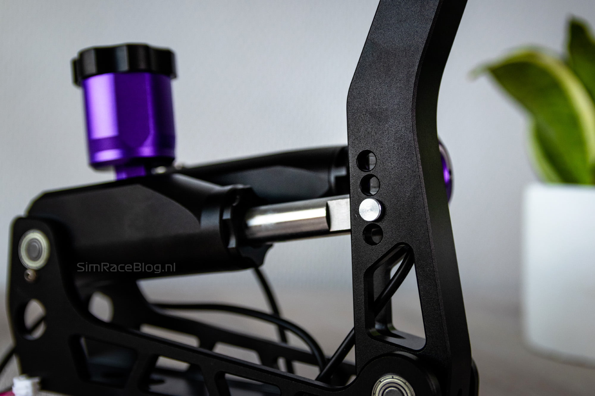 Adjusting the throttle pedal is extremely easy and requires no tools. By removing the locking pin, the angle of the axis where the spring is mounted can be adjusted. There are a total of four options, with the lowest being the softest setting and the highest being the firmest. We have tried the different settings and find that this is a well-balanced range. However, for shortening the travel, a preload on the spring is automatically set, resulting in a slightly heavier initial pedal feel with a shorter travel. We opted for the highest, firmest setting with a shortened travel on the pedal and are very pleased with the throttle pedal in this configuration. That being said, this throttle pedal is also a comfortable option for sim racers who prefer a lighter throttle pedal.