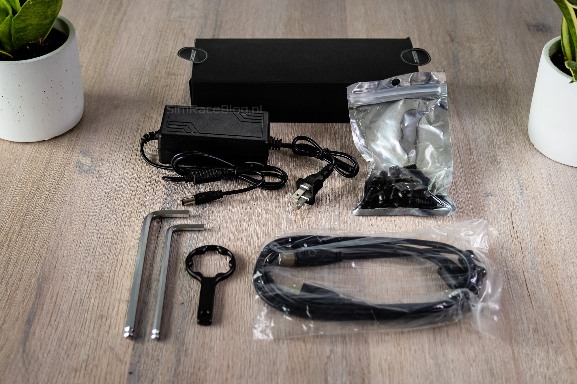 Despite already having high expectations, Conspit manages to surprise us when opening the CPP.Lite product box. The first thing we notice is a partially transparent ‘Sketch Show Board,’ featuring an artistic illustration of the pedal set in black and purple, along with the steps to follow for setting up the pedals. This demonstrates that Conspit takes not only the development of their product but also the user experience very seriously. Beneath the Sketch Show Board, there’s a layer of soft black foam containing the pedal manual and several stickers in soft, semi-transparent pouches placed in cutouts of the foam. Simultaneously, there’s a cutout revealing the hydraulic brake module of the brake pedal, showcasing the first purple accent of the pedal set. Below this foam layer, the CPP.Lite pedals with their beautiful purple accents are waiting for us, perfectly nestled in well-formed cutouts—the clutch, brake, and throttle pedals. In between them, there’s an elongated, matte black cardboard box. Unpacking it reveals the power adapter, mounting materials, tools, and the USB cable. Unfortunately, it’s disappointing to see that the power adapter has a Chinese plug, and no European adapter is included for use with a European power outlet.