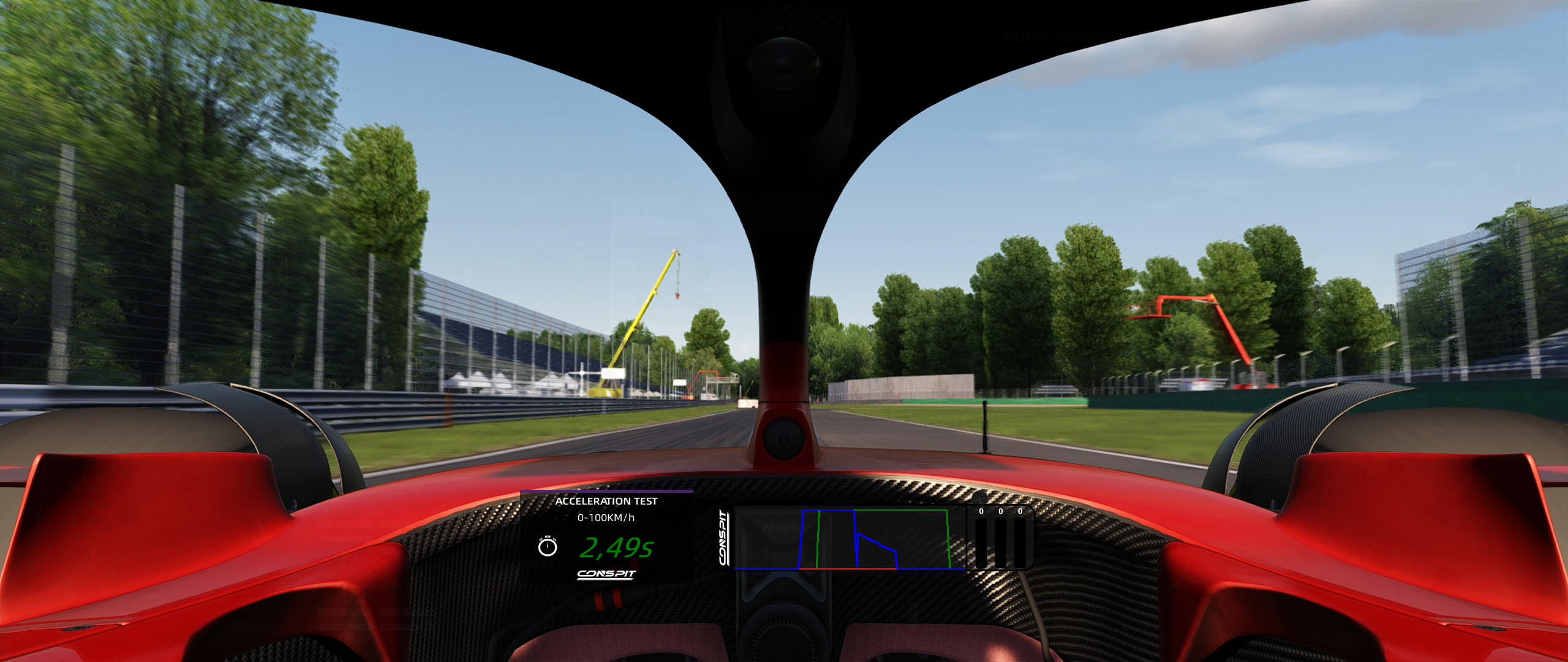 At the time of writing, Conspit Link includes two plugins that can be used: the live graph with telemetry data from the pedals, and the 0-100km/h plugin. These plugins function as an external overlay on top of the game. By simply activating the plugin, it appears on the screen immediately. The live telemetry data from the pedals works right away, and we can easily drag, resize, or minimize it on the screen while driving in Assetto Corsa. The plugin only displays live information, so telemetry data cannot be saved or reviewed later.