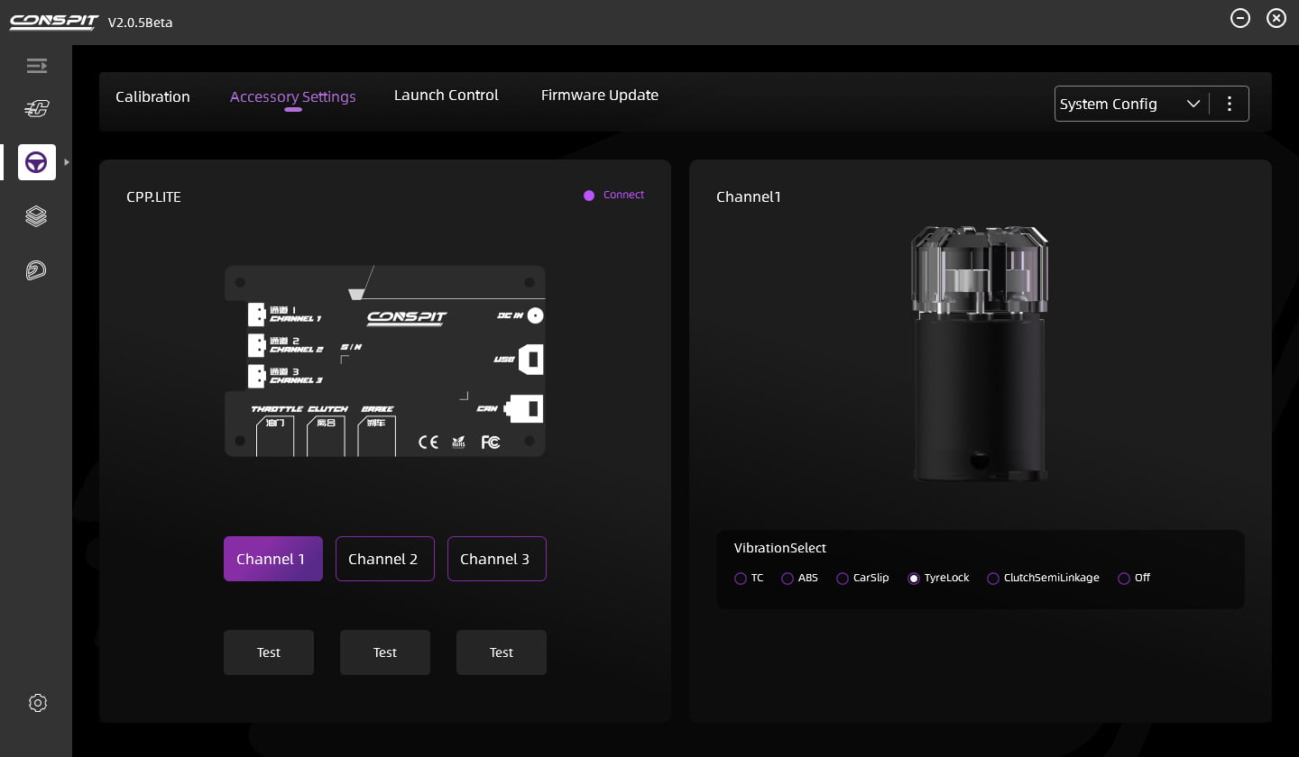 On the Accessory Settings tab, we can test and set up the M-DVF haptic feedback motors. However, there is no option to adjust the strength or frequency of the motors. We can only choose which effect we want to feel on each pedal. The available options include Traction Control, ABS, Car Slip, Tyrelock, and ClutchSemiLinkage.