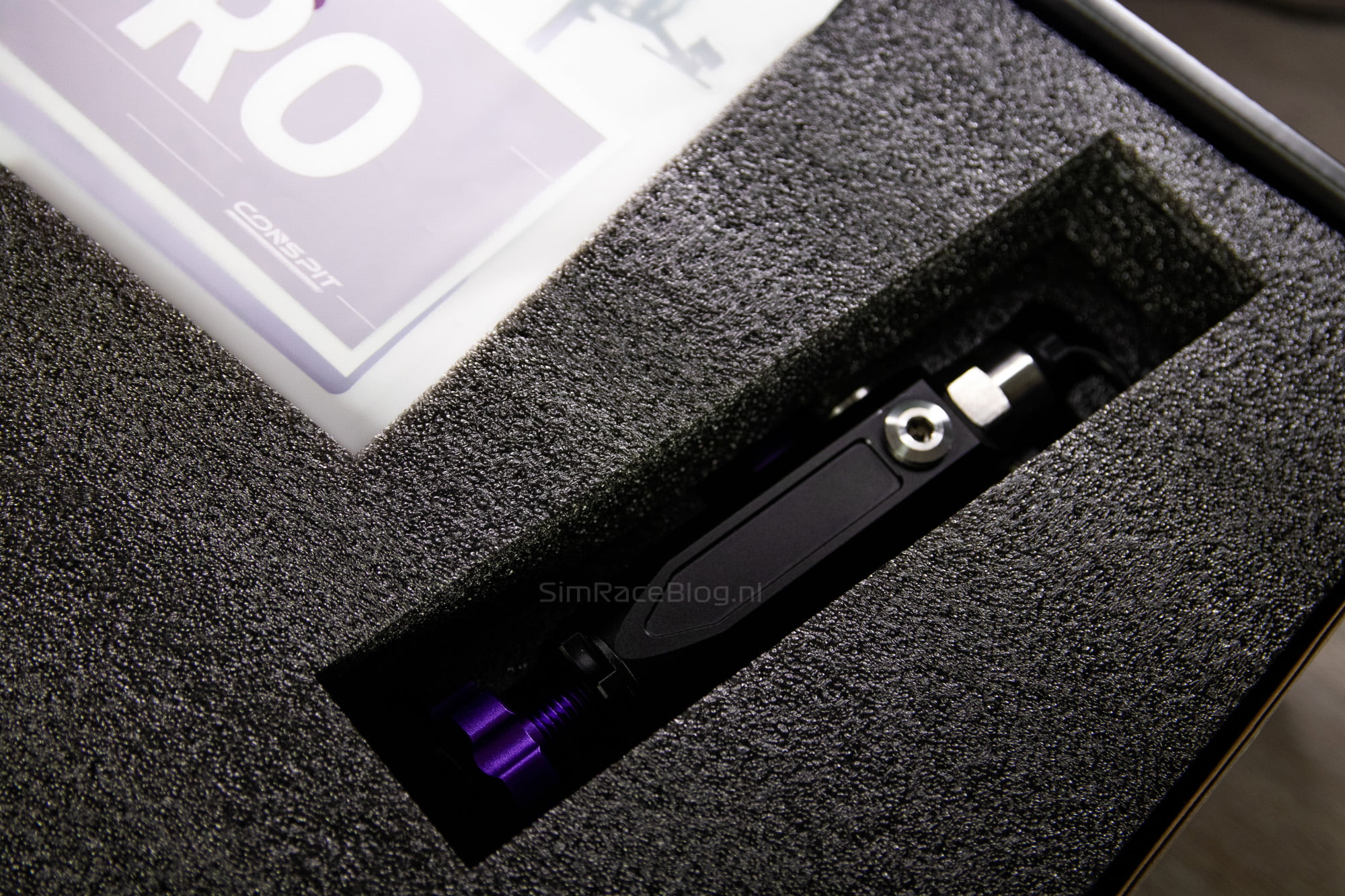 Despite already having high expectations, Conspit manages to surprise us when opening the CPP.Lite product box. The first thing we notice is a partially transparent ‘Sketch Show Board,’ featuring an artistic illustration of the pedal set in black and purple, along with the steps to follow for setting up the pedals. This demonstrates that Conspit takes not only the development of their product but also the user experience very seriously. Beneath the Sketch Show Board, there’s a layer of soft black foam containing the pedal manual and several stickers in soft, semi-transparent pouches placed in cutouts of the foam. Simultaneously, there’s a cutout revealing the hydraulic brake module of the brake pedal, showcasing the first purple accent of the pedal set. Below this foam layer, the CPP.Lite pedals with their beautiful purple accents are waiting for us, perfectly nestled in well-formed cutouts—the clutch, brake, and throttle pedals. In between them, there’s an elongated, matte black cardboard box. Unpacking it reveals the power adapter, mounting materials, tools, and the USB cable. Unfortunately, it’s disappointing to see that the power adapter has a Chinese plug, and no European adapter is included for use with a European power outlet.