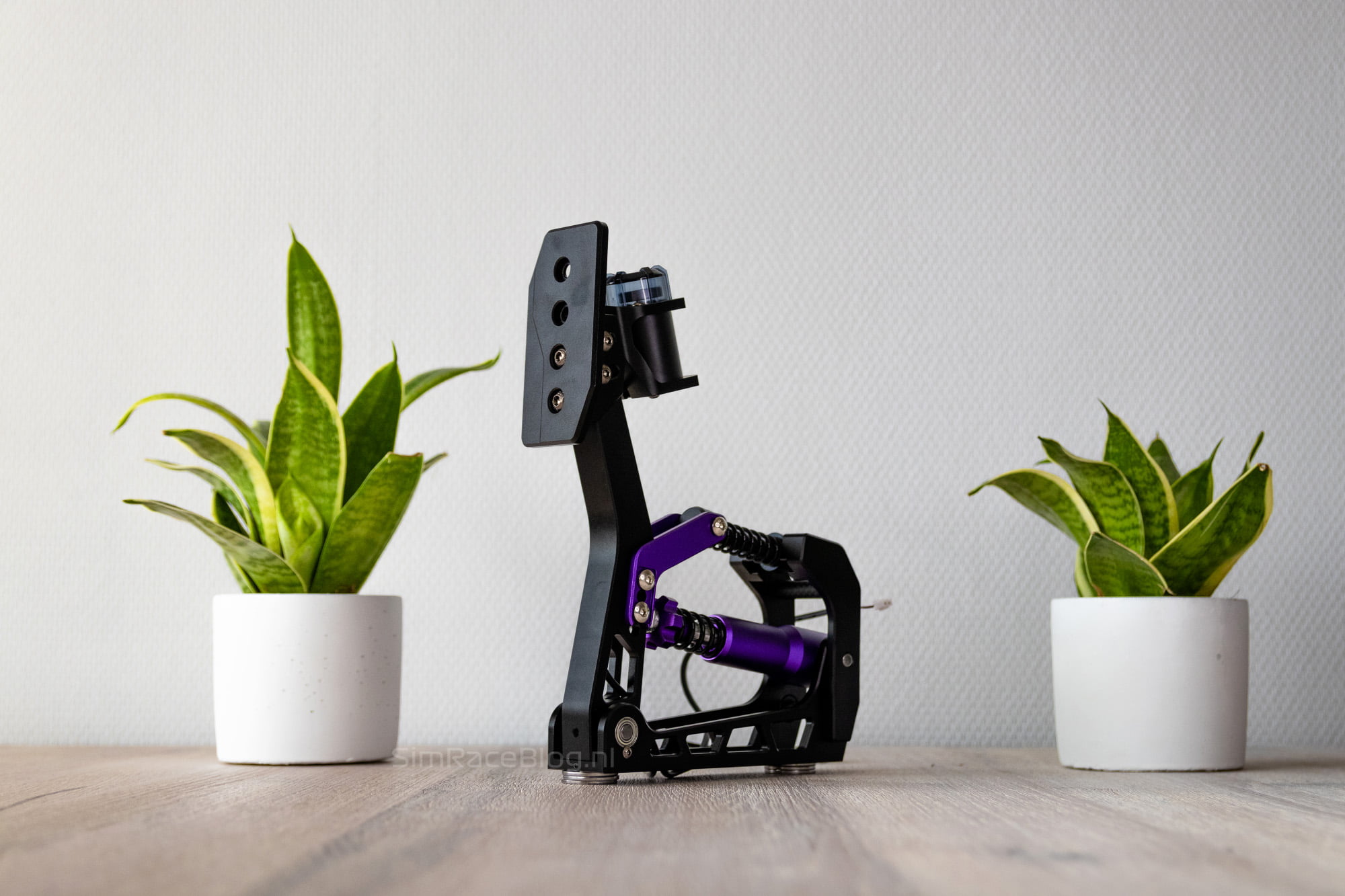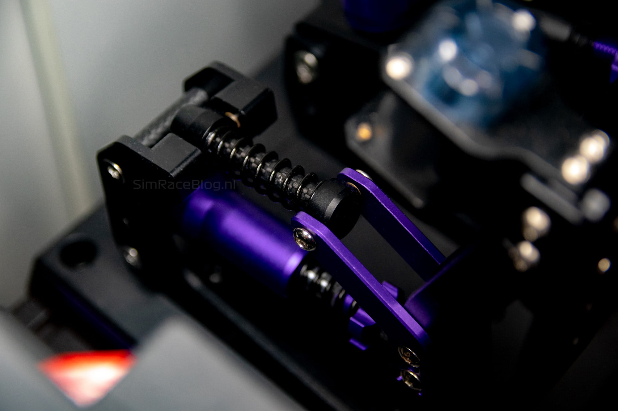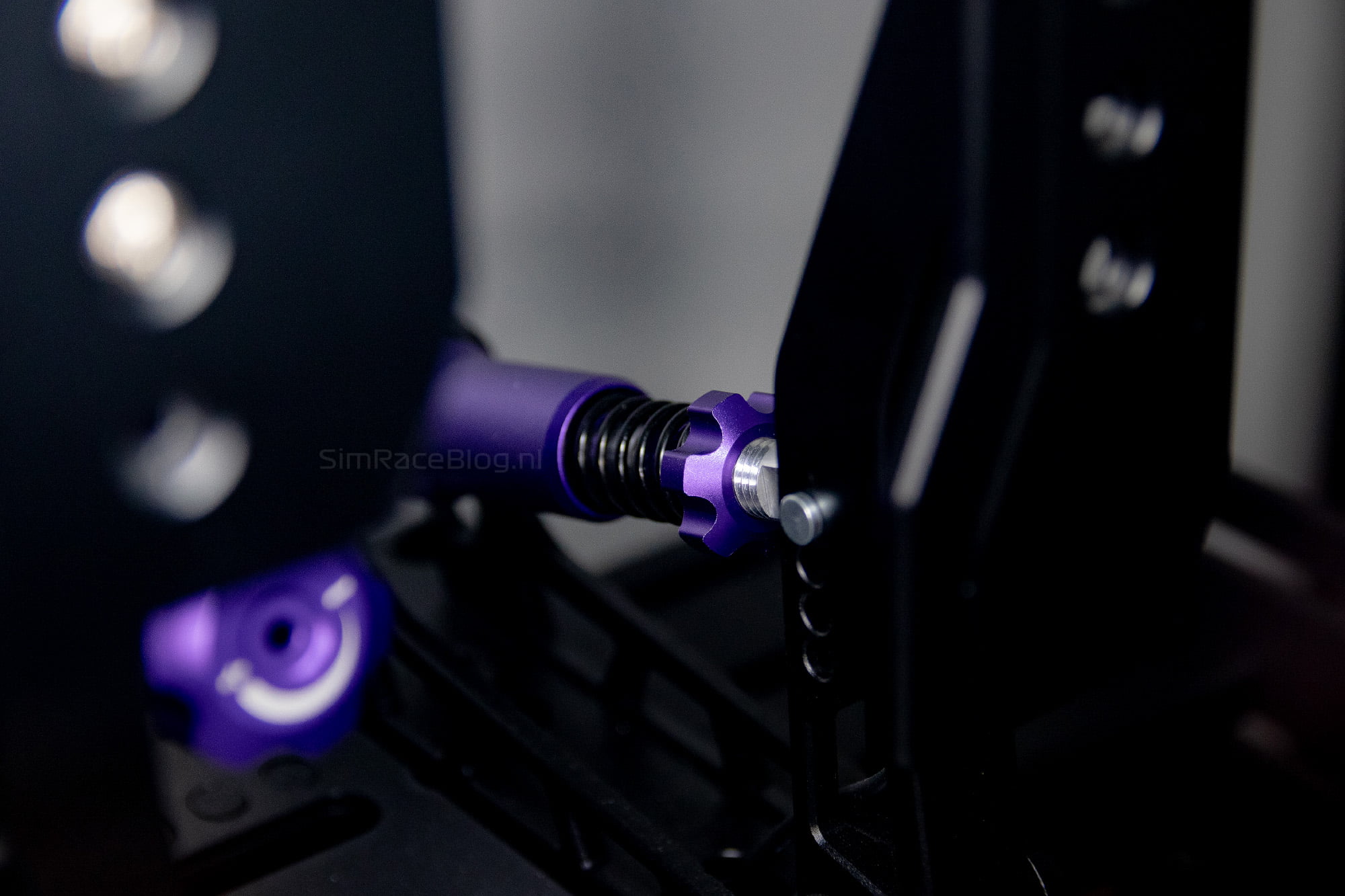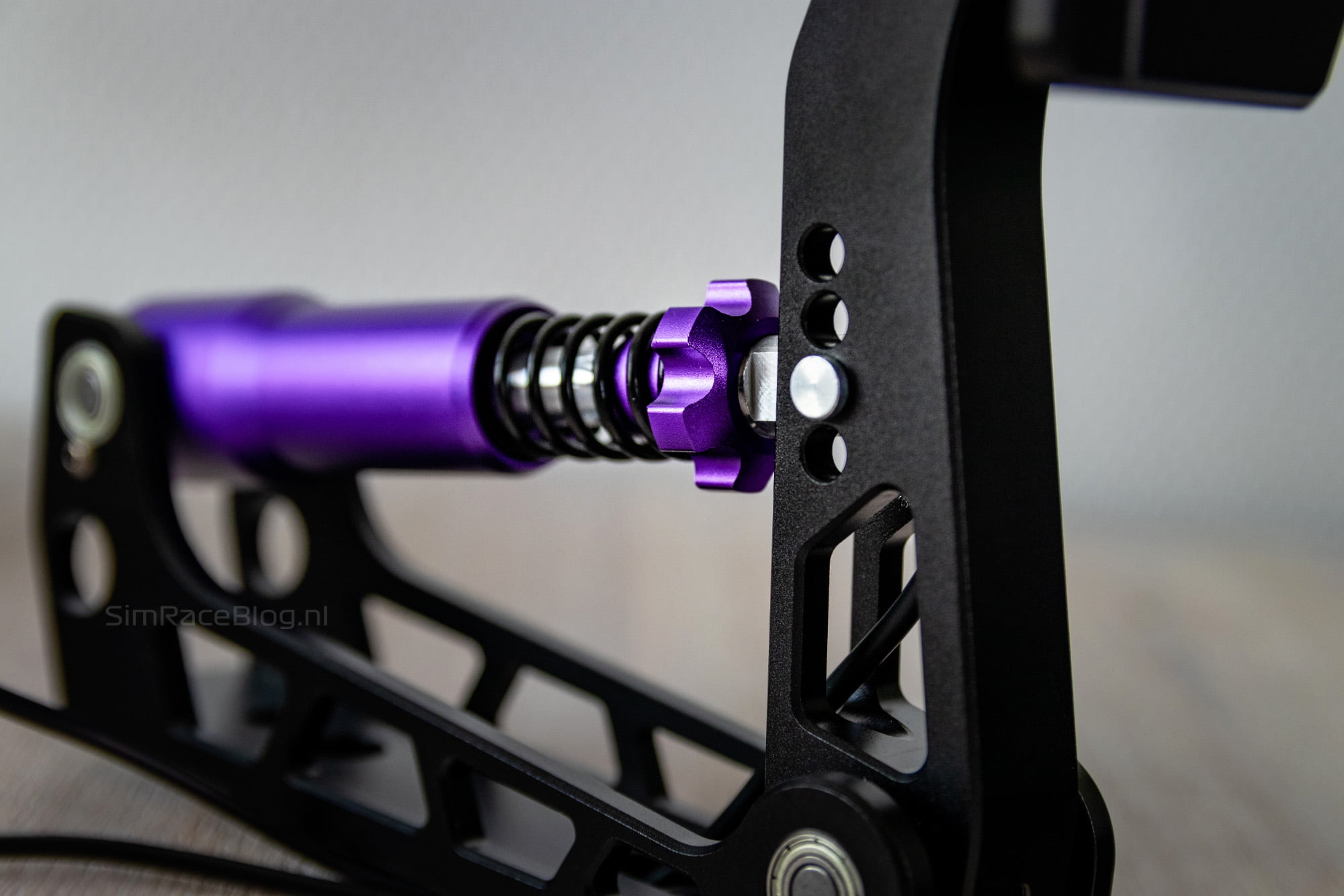 Adjusting the throttle pedal is extremely easy and requires no tools. By removing the locking pin, the angle of the axis where the spring is mounted can be adjusted. There are a total of four options, with the lowest being the softest setting and the highest being the firmest. We have tried the different settings and find that this is a well-balanced range. However, for shortening the travel, a preload on the spring is automatically set, resulting in a slightly heavier initial pedal feel with a shorter travel. We opted for the highest, firmest setting with a shortened travel on the pedal and are very pleased with the throttle pedal in this configuration. That being said, this throttle pedal is also a comfortable option for sim racers who prefer a lighter throttle pedal.