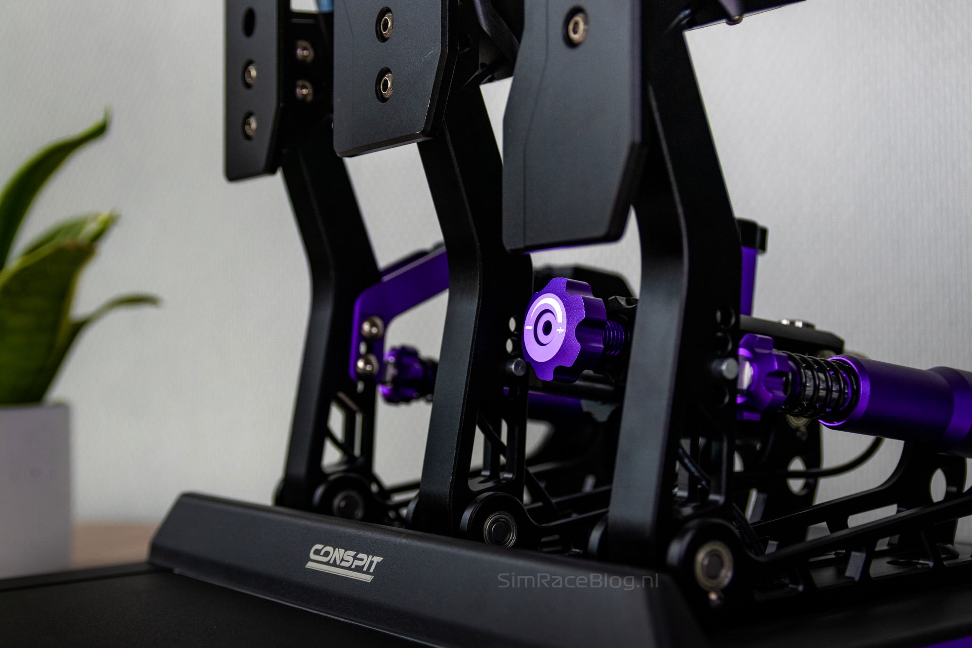 The Conspit CPP.Lite pedal set shares many similarities with its predecessor, the CPP Series pedal set. However, the CPP.Lite set has its own design and unique appearance. Fundamentally, the pedal set is once again constructed entirely from high-quality CNC-machined aluminum with a matte black finish. The accent color is a stylish satin purple, creating a distinctive look that is tastefully applied to the pedals. The CPP.Lite pedals feature smooth, flat footplates that are adjustable in height and of which the angle can be tilted between 0 and 10 degrees. All three pedals are equipped with haptic feedback motors, which Conspit refers to as the M-DVF system, standing for Multi-Dynamic Vibration Feedback. The overall build quality of the pedals feels exceptionally good, and we can’t help but commend Conspit for it.