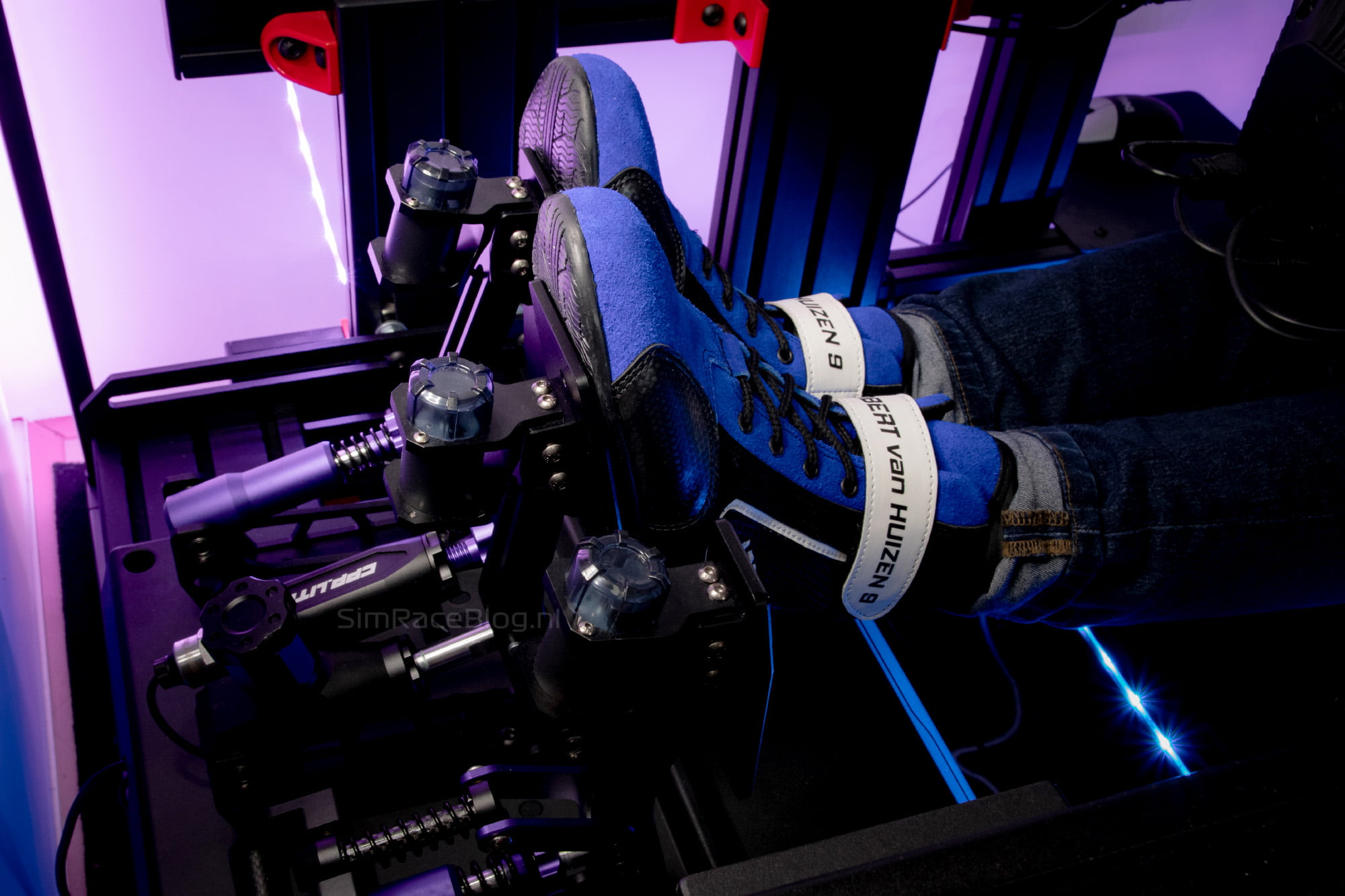 The initial impression we get from the Conspit CPP.Lite pedal set is simply familiar. On one hand, this is influenced by our experience with its predecessor, but even without considering that experience, the CPP.Lite pedal set gives us a familiar feeling. The pedals feel very robust, smooth, and accessible under our feet, making the process of getting a feel for them very brief. We don’t feel any play in the pedals, making them feel extremely solid. The flat footplates take some getting used to compared to the curved footplates of their predecessor, which we personally found very comfortable. However, the flat footplates are by no means a downgrade; they have a good size for us and feel comfortable under foot, although they are quite smooth. The extended footplate of the throttle pedal is a comfortable addition, ideal for applying the ‘heel-toe’ technique. The plastic heel plate surprises us; we secretly expected an uncomfortable experience, but that turns out to be an unfounded expectation. It’s not as comfortable as the aluminum heel plate of its predecessor, but it’s not uncomfortable. What is a bit disappointing is that the raised edge of the heel plate in the plastic version cannot be adjusted.