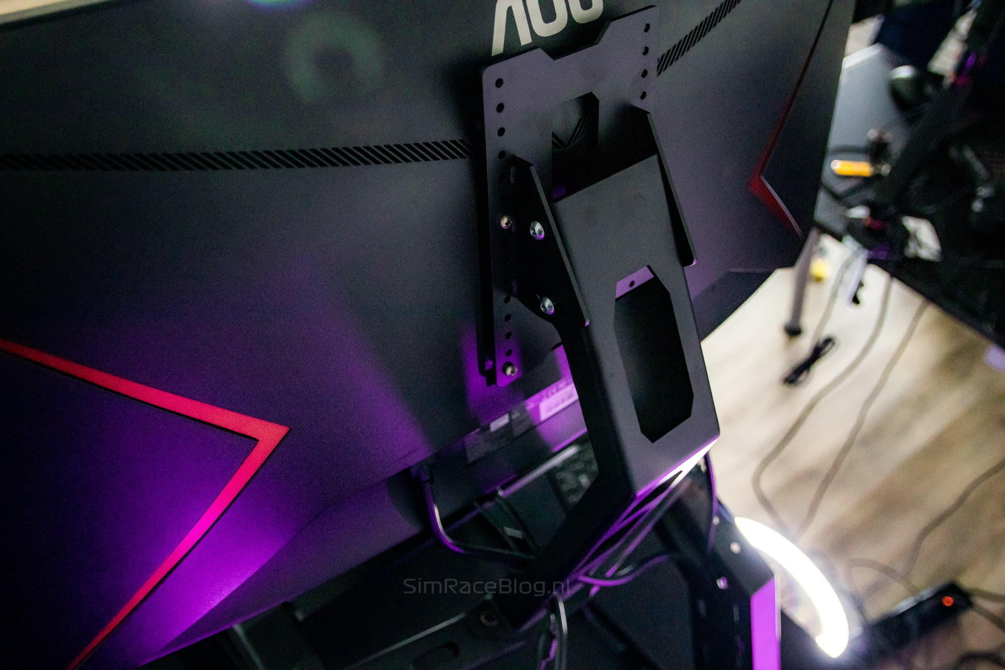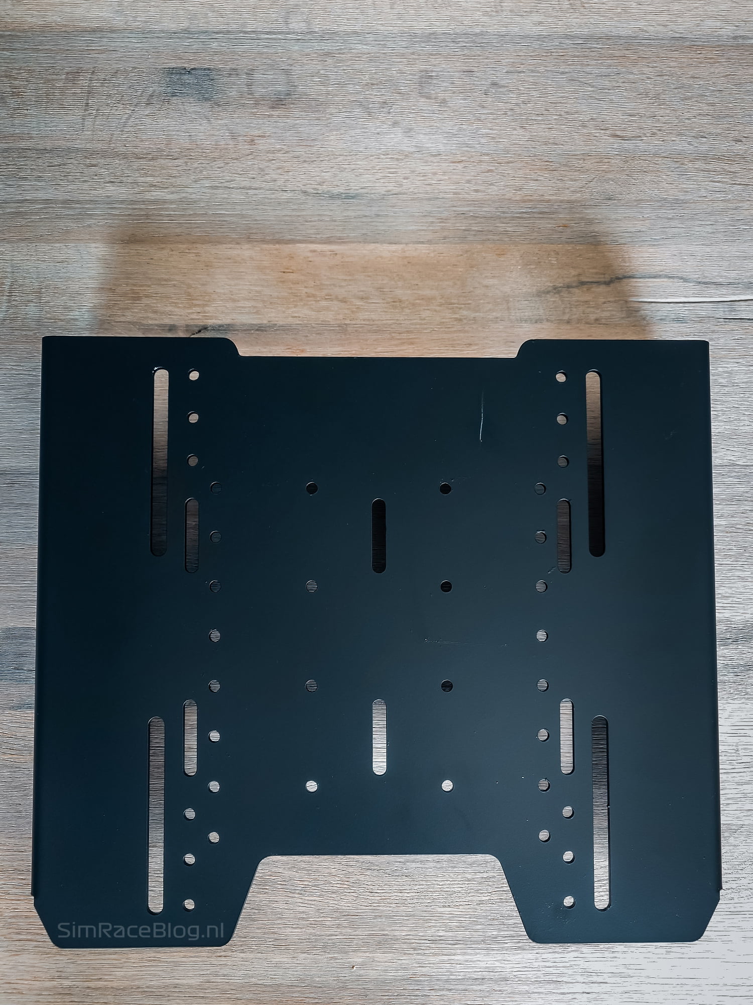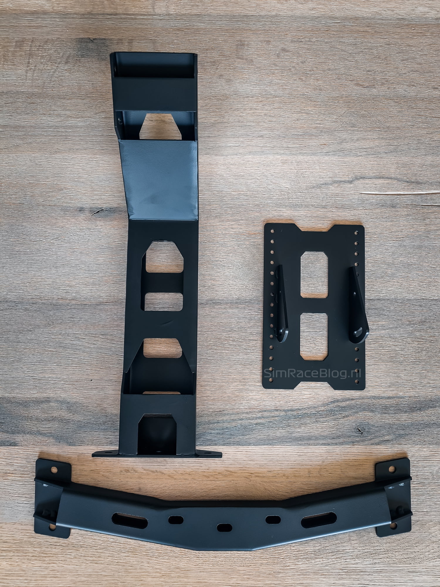 The last component we need to mount on the FP-Lite rig is the monitor stand. Conspit offers an optional monitor stand that can be attached directly to the cockpit. This stand is secured to the arms holding the wheel deck by means of a crossbar. It can be mounted in three different positions, allowing the screen to be positioned higher and closer to your wheelbase or lower and farther away. An additional advantage of mounting it in this location is that the rig gains some extra rigidity due to the placement of this crossbar. On this crossbar, we then attach the vertical stand and the plate to which the screen itself will be mounted. This plate features two rows of 15 holes, allowing you to position the screen at seven different heights. Please note that this monitor stand is only compatible with screens that have a 100mm x 100mm VESA hole pattern on the back. If your screen has a different size, it’s advisable to use a separate monitor stand. Since this monitor stand is connected to the wheel deck, we delay placing the monitor itself until we are certain that our wheelbase is correctly positioned for our comfort. This ensures that we can set up our racing simulator to our preferences before finalizing the monitor placement.