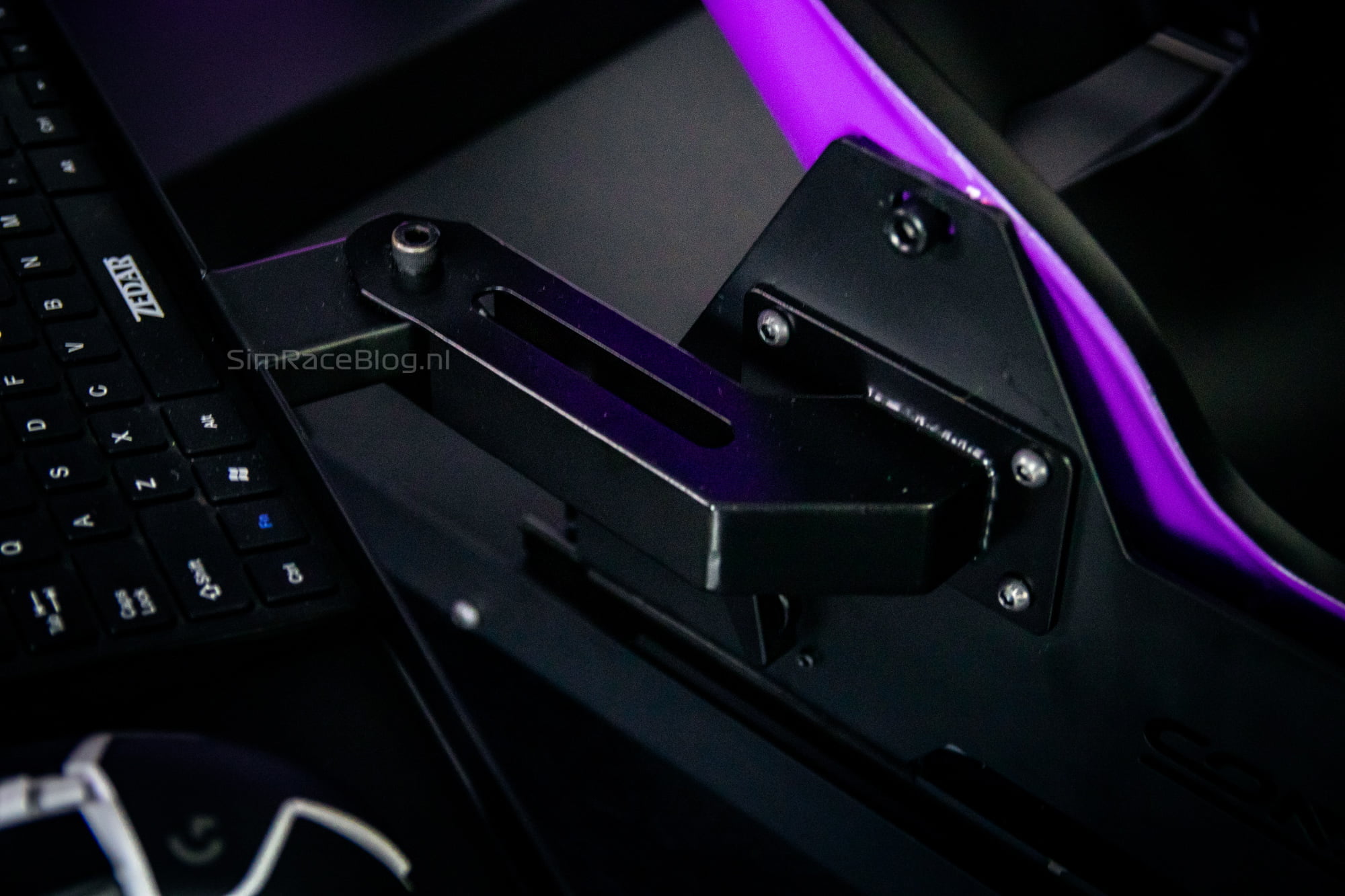 The seat provided with the FP-Lite by Conspit is a stylish formula bucket seat made of hard plastic material. Its interior boasts a matte black finish that feels comfortably soft to the touch, while the exterior features a glossy purple coating for a vibrant look. Notably, the seat has several slots, including one in the front between the legs, on both sides of the hip position, and two in the backrest beside the spine. These slots allow for the installation of a harness system, enhancing the immersive experience. On either side of the seat, there are threaded holes for attaching the seat to the rig’s base frame. The base frame features a sliding system with a lever, enabling you to adjust the seat over a length of 17.5cm. The entire system is robust enough to support simracers weighing up to 150kg.