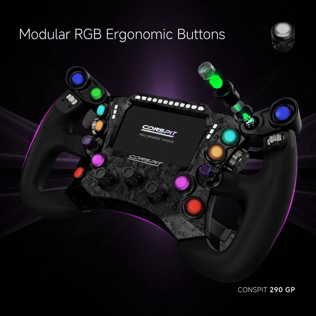 In addition to the Direct Drive Base, Conspit Racing has also introduced a new steering wheel: the 290 GP Steering Wheel. This wheel has a design reminiscent of the Conspit H.AO HUB, which also features a carbon fiber casing, but it is equipped with a significantly smaller display. The standout features of this wheel include its striking, highly ergonomic design and the use of genuine carbon fiber.