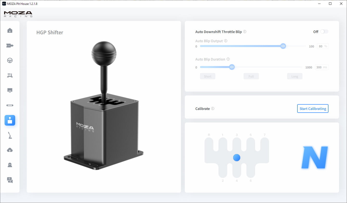 The number of settings for the HGP Shifter isn’t extensive, but that’s somewhat the nature of the product. There’s one screen available where the shifter can be calibrated, and where you can visually test all the gears. Additionally, on this screen, there’s an option for the “Auto Downshift Throttle Blip”. This function can only be used when you’re also using a MOZA pedal set. It provides a brief throttle input when downshifting, eliminating the need for the ‘heel-toe’ technique. Users can customize the duration of this throttle input and the percentage to which it engages. Since we don’t have a MOZA pedal set, unfortunately, we can’t activate this function. With the MOZA HGP Shifter calibrated and tested, there’s only one thing left to do – drive!
