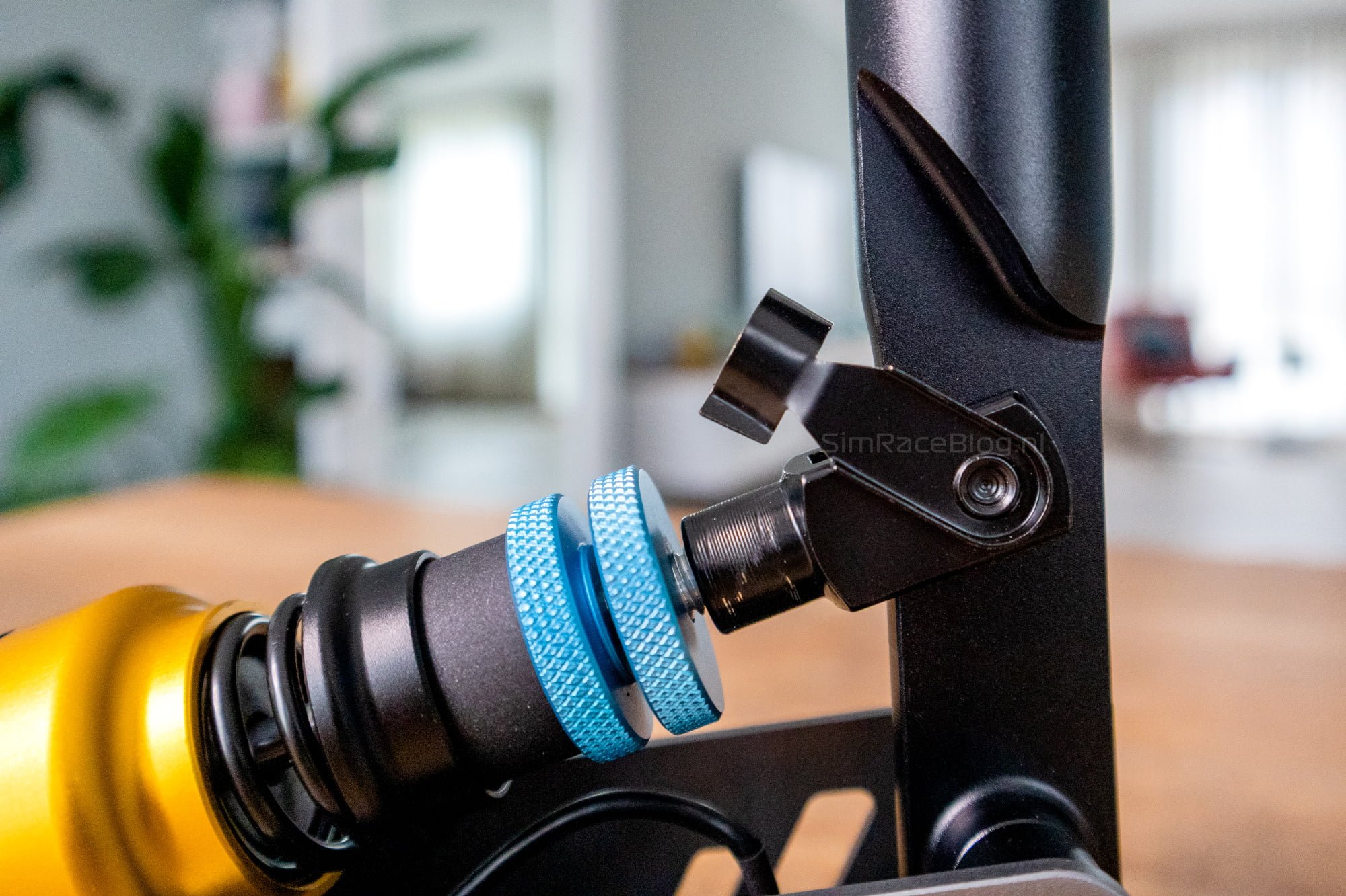 The process of replacing the elastomer and/or spring is fundamentally simple and can be done in two ways. The first option, by releasing all tension with the blue adjustment knobs, pushing the entire axle out of the end stop and removing all components from that side including the load cell sensor. However, we find this somewhat intimidating the first time we attempt it, as there are quite a few small parts to detach and reassemble, including the careful handling of wiring and the sensor. Once familiar with what to watch out for, it turns out to be quite manageable, as everything essentially fits back in only one correct way. On the other hand, after releasing tension with the adjustment knobs, the pin connecting the axle to the lever can be removed. Afterward, we can tilt the entire axle backward and replace the components from the top.