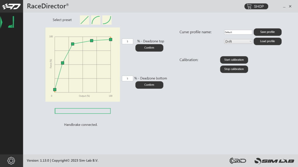 For those who don’t want to create a curve themselves, Sim-Lab has integrated three pre-set curves: a linear one, a degressive one, and a progressive curve. Finally, you can also save and load your settings as a preset. Since we primarily use our handbrake for drifting and value the ability to quickly lock the rear wheels, we opt for a steeply ascending curve. With the handbrake configured, it’s time to hit the road (and dirt)!