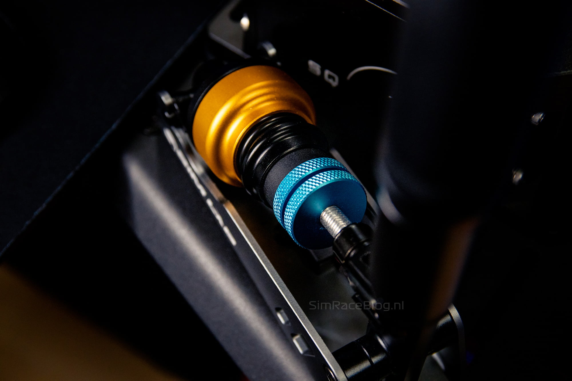 The Sim-Lab XB1 Load Cell Handbrake is fundamentally constructed entirely from an aluminum structure with a high-quality finish. The entire handbrake itself is free of sharp edges or corners, with only the pin connecting the lever to the axle feeling sharp. The sensor in the XB1 is, as its name suggests, a load cell sensor capable of registering up to 150kg of pressure. Sim-Lab has designed their own load cell sensor and stylishly integrated it into their hardware, positioned directly on the axle with the elastomer and spring. Fundamentally, the entire mechanism of the sensor, elastomer, spring, and adjustment rings looks the same as that of the XP1 pedal set. The main difference is that the pedal set is equipped with a load cell sensor with a bit more capacity, specifically one that can handle up to 200kg. Including the pre-installed elastomer the XB1 handbrake comes with elastomers with hardness ratings (from softest to hardest) of 40a, 50a, 60a, and 70a shore.