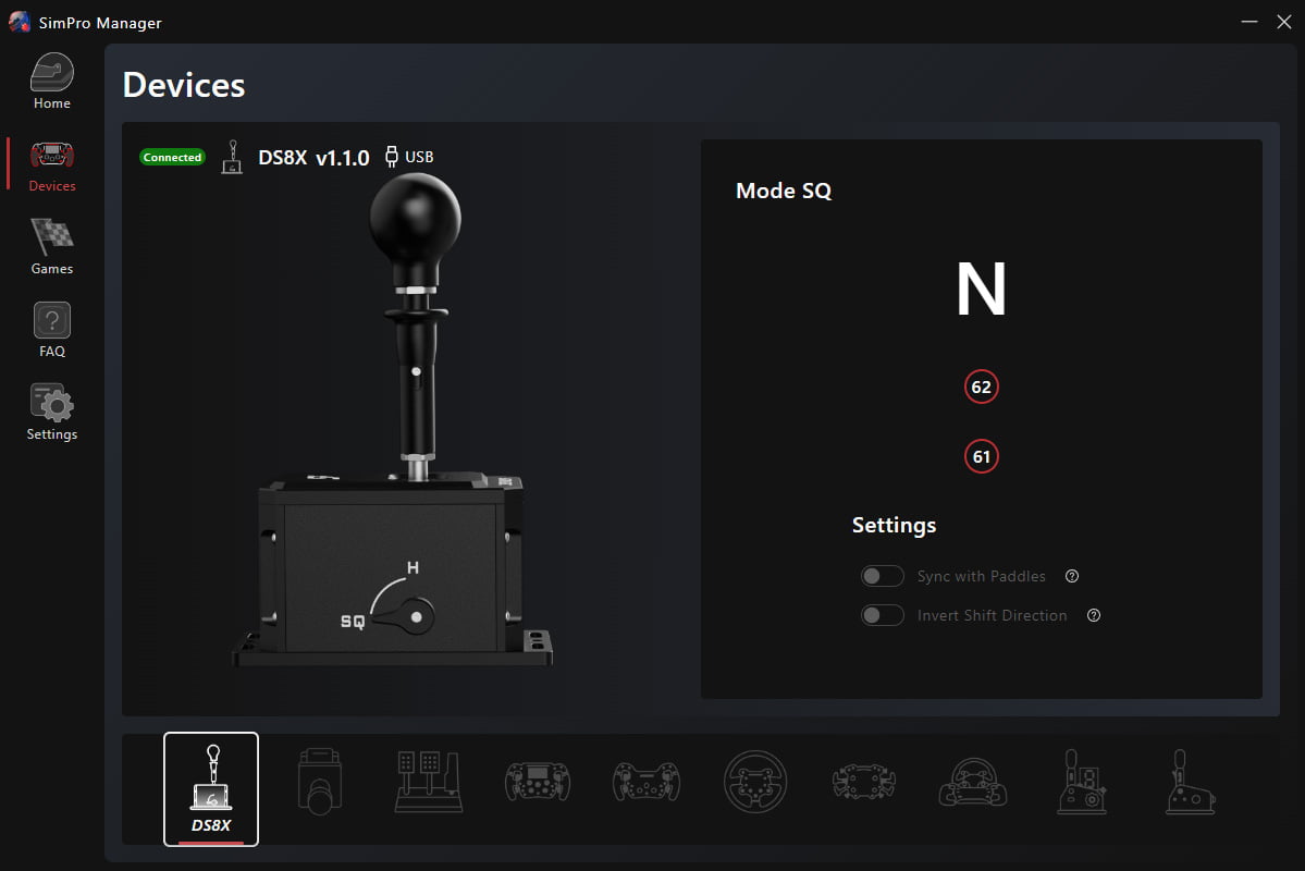 Within the software package itself, there isn’t much we can do, which is not surprising for a gear shifter. From SimPro Manager, we can calibrate the gear shifter when necessary, and visually check if all gears are functioning properly. When we switch to sequential mode using the button on the side of the gear shifter, the visuals in SimPro Manager change, revealing a few additional options available only through the CAN bus, which we do not use.