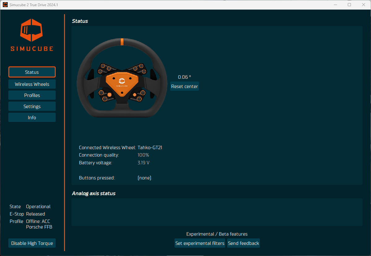 To use the Tahko steering wheel, we need to connect it in the Simucube True Drive software. This software is available to be downloaded from the Simucube website and is necessary for using a Simucube wheelbase and the Tahko steering wheel. It’s simply a matter of turning on the steering wheel, after which the software will display it as ‘device to connect’ after a few seconds. Upon selecting the steering wheel, we can click on ‘connect selected device’. Shortly after, the steering wheel will emit a sound as confirmation that it’s correctly connected to the wheelbase, which is also indicated by the status LED on the front of the steering wheel. After this, it’s a matter of calibrating the center point, and it’s ready for use. All of these steps are straightforward and can be completed within a minute.