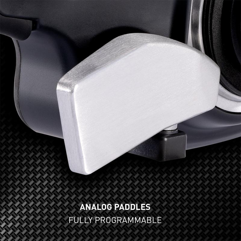 Crafted of 100% aluminum for optimal sturdiness and handling, the magnetic paddle shifters allow for clear, precise activation to avoid driving errors, and provide an unlimited lifespan. There are also two customizable analog paddle shifters on the back of the wheel.