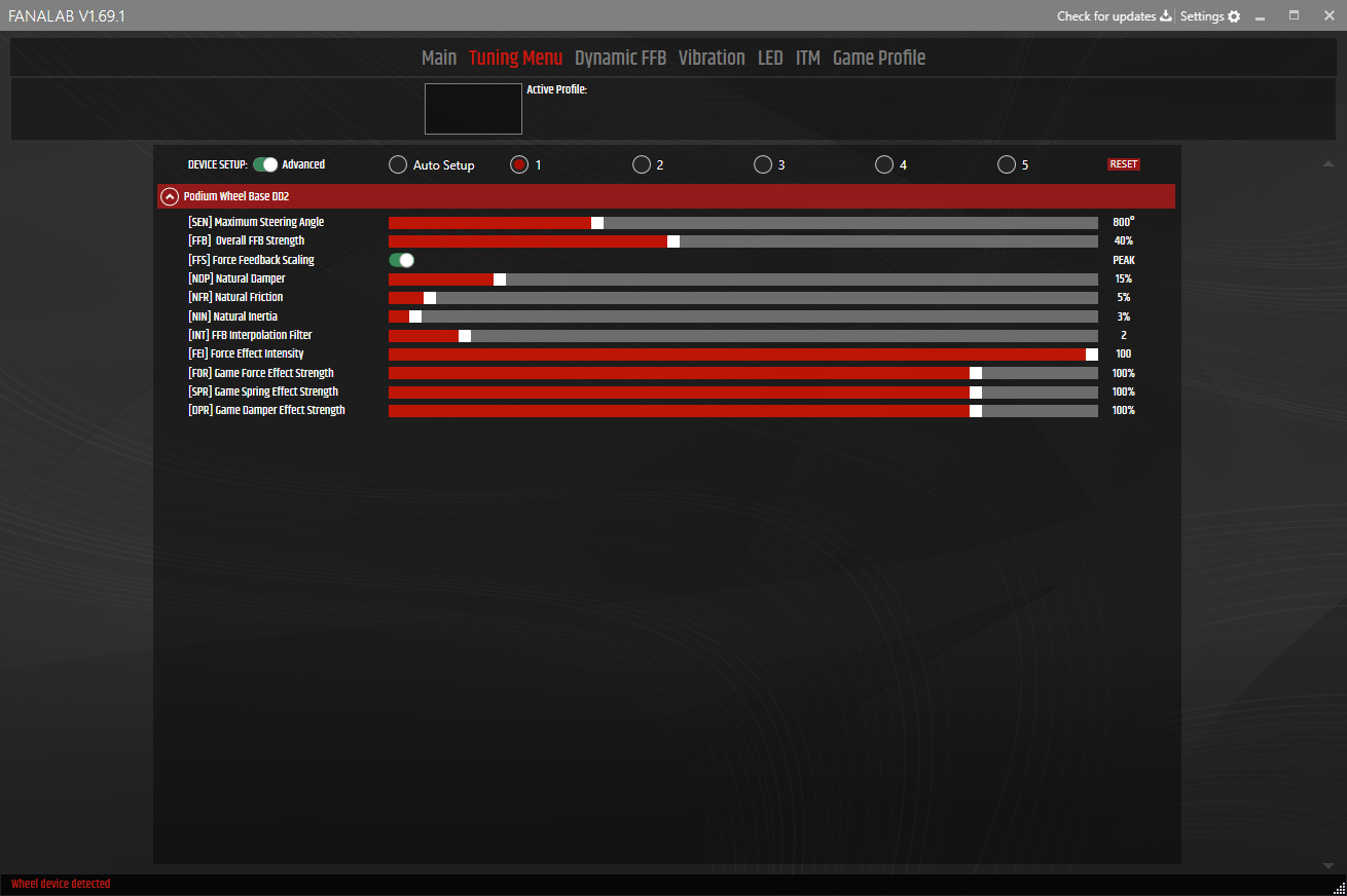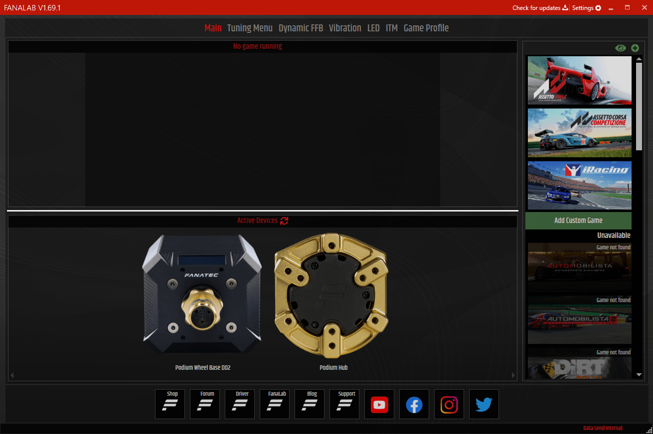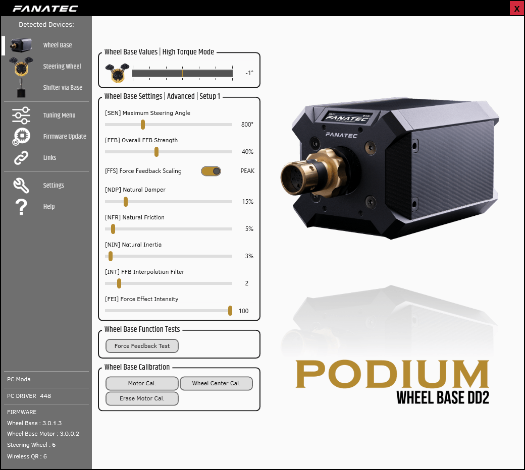 Om de Fanatec Podium Wheelbase DD2 te kunnen gebruiken moet je minimaal de Fanatec Drivers hebben geïnstalleerd. Wil je gebruik maken van bijvoorbeeld ITM, Fanatec LED, Dynamic FFB of de mogelijkheid om instellingenprofielen te koppelen aan racegames dan zul je ook de Fanalab software moeten installeren. Beiden programma’s werken prima samen, dus kun je het beste alle instellingen vanuit Fanalab doen. Let op dat je van beiden de laatste versies installeert zodat je een compatible versie van Fanalab gebruikt bijbehorend aan de Fanatec Drivers. Ook is er ook een Fanatec App voor Android en iOS beschikbaar, maar aangezien deze op het moment van schrijven nog in testfase is gaan we deze niet behandelen in deze review. Het is raadzaam om na het installeren van de Fanatec Drivers eerst een firmware update te doen vanuit deze software. Dit kan heel eenvoudig vanuit het menu van de Fanatec Drivers software en is niet beschikbaar in de Fanalab software.