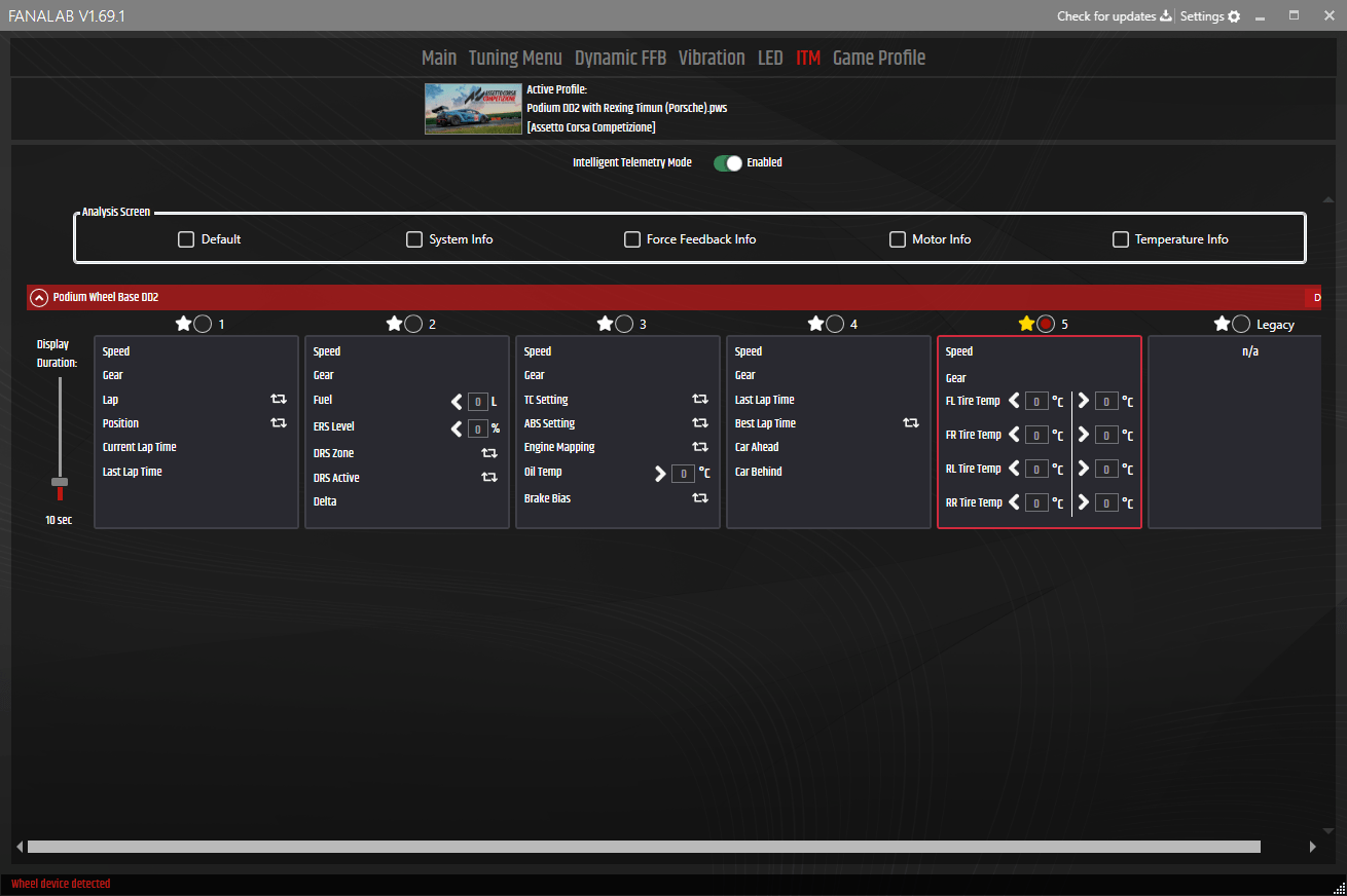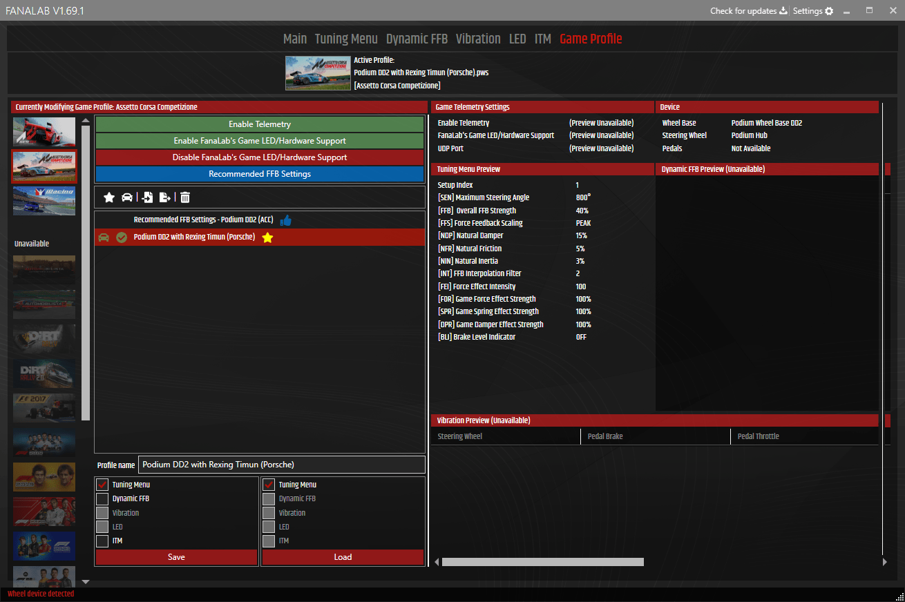 Wij gebruiken naast de driver software ook de Fanalab software, hierin zullen we onze instellingen doen. Op het Fanatec Forum staan aanbevolen instellingen die via de community gedeeld worden, deze zijn geschikt voor jouw favorite racegame(s) en platform(en). Ook staan de aanbevolen instellingen standaard in Fanalab, deze zijn in het menu ‘Game Profile’ per racegame met één klik op de blauwe knop ‘Recommended FFB Settings’ in te stellen. De meeste instellingen zijn persoonlijk, maar de aanbevolen instellingen zijn erg goed om verder mee te gaan fine-tunen. We testen de DD2 in Assetto Corsa Competizione waarbij we gebruik maken van deze Fanatec aanbevolen instellingen en de specifieke rotatie-instellingen (SEN) opgegeven door, ervaren Assetto Corsa Competizione rijder, James Baldwin. Op deze YouTube video wordt dit erg goed uitgelegd. Deze instellingen kun je ook weer per auto koppelen via de meest recente Fanalab software. Tevens maken we een uitstapje naar Assetto Corsa met deze Fanatec aanbevolen instellingen en de mod van Race Sim Studio voor de 2022 Formule 1 auto’s. Als sturen gebruiken we afwisselend de Rexing GT Timun, de Innato GT (review volgt) en het Fanatec ClubSport F1 2021 LE.