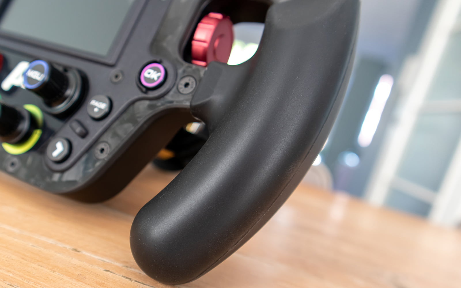 Aan de voorkant van het stuurwiel zit een 4.3 inch Vocore LCD-scherm met touchscreen functionaliteit. Om het LCD-scherm bevinden zich 22 RGB LED’s waarvan er 16 boven het scherm zitten en 3 stuks aan zowel de linker- en rechterkant. Het stuurwiel is verder voorzien van 14 push buttons, 2 rotary encoders, 2 thumb rotary encoders en 2 stuks 12-positie rotary encoders.