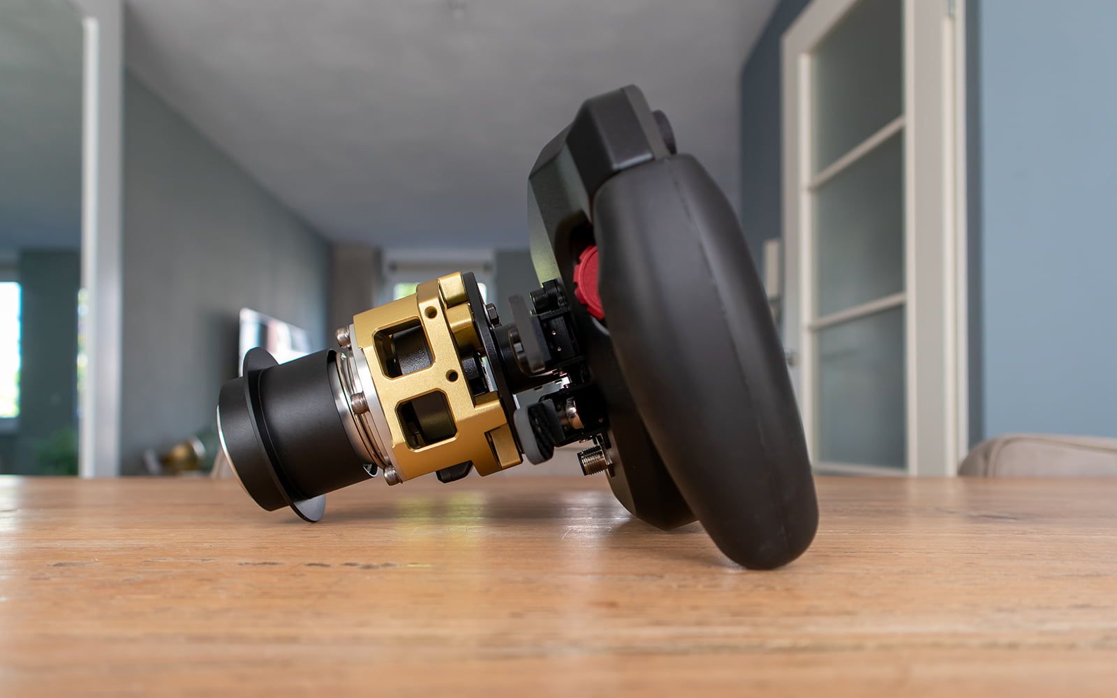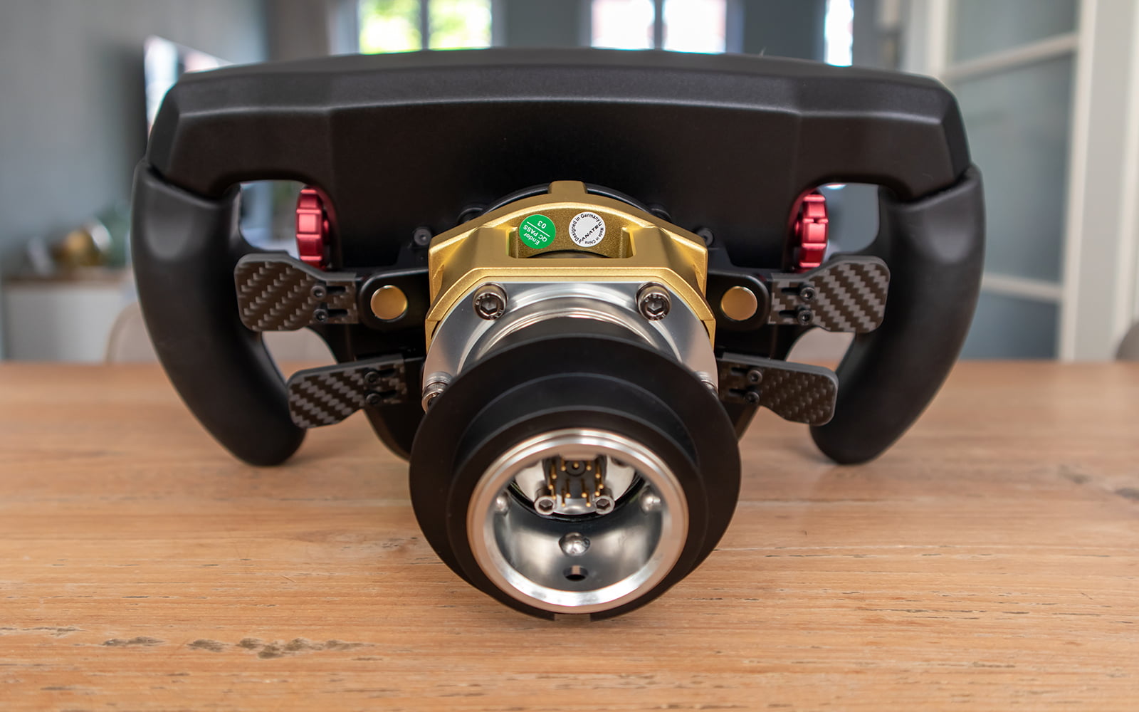 We gaan het stuurwiel gebruiken op onze Fanatec wheelbase, hiervoor monteren een Fanatec Podium Hub op het P1Sim Eau Rouge stuurwiel. Je monteert de Podium Hub eenvoudig met 3 bijgeleverde M5 boutjes en je bent klaar. Om het stuurwiel optimaal te gebruiken is een powered USB-hub noodzakelijk. De bijgeleverde USB-kabel heeft 2 USB-poorten van deze hub nodig. Standaard slaan we de USB-kabel van het stuurwiel eerst om de QR van de Podium Hub heen en sluiten deze dan aan op de USB-hub, hiermee voorkom je loshangende kabels die je alleen maar in de weg zitten tijdens het rijden. De bijgeleverde USB-kabel is echter lang (2.5 meter) en vrij stug wat dit handigheidje toch enigszins bemoeilijkt. Uiteindelijk vragen we ons ook af waarom er twee USB-poorten nodig zijn voor dit stuurwiel en niet één zoals op de meeste stuurwielen met een display.