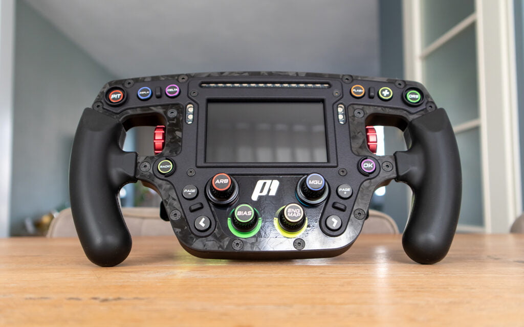 Het P1Sim Eau Rouge stuurwiel voelt erg goed en stevig aan. De gebruikte materialen zoals de (forged)carbon frontplaat en de aluminium behuizing zorgen voor een zeer solide constructie. De handvatten zijn comfortabel en gewoon precies goed. Doordat de handvatten van rubber zijn kan dit soms voor klamme handen zorgen en het dragen van handschoenen is hierbij handig maar geen must.