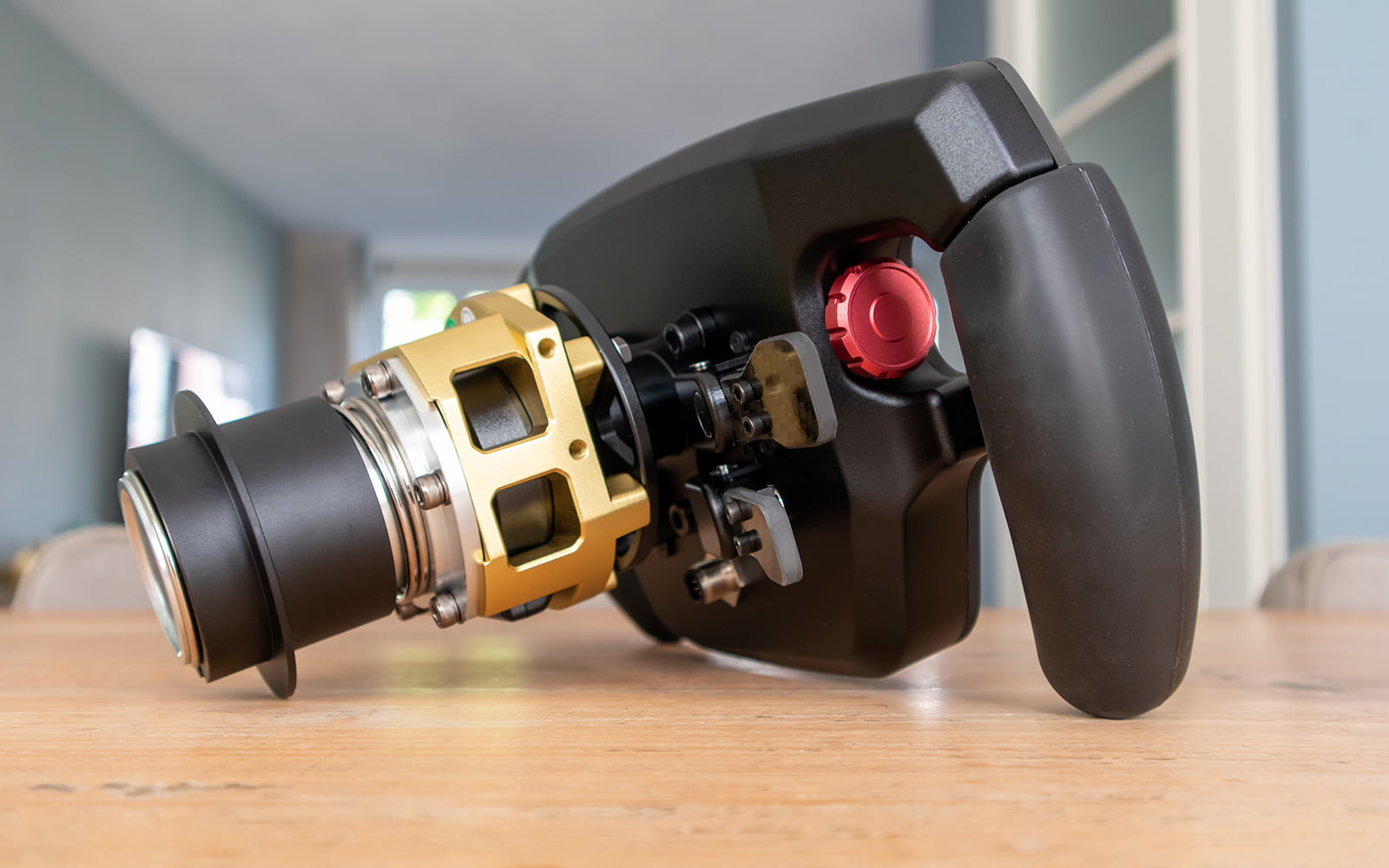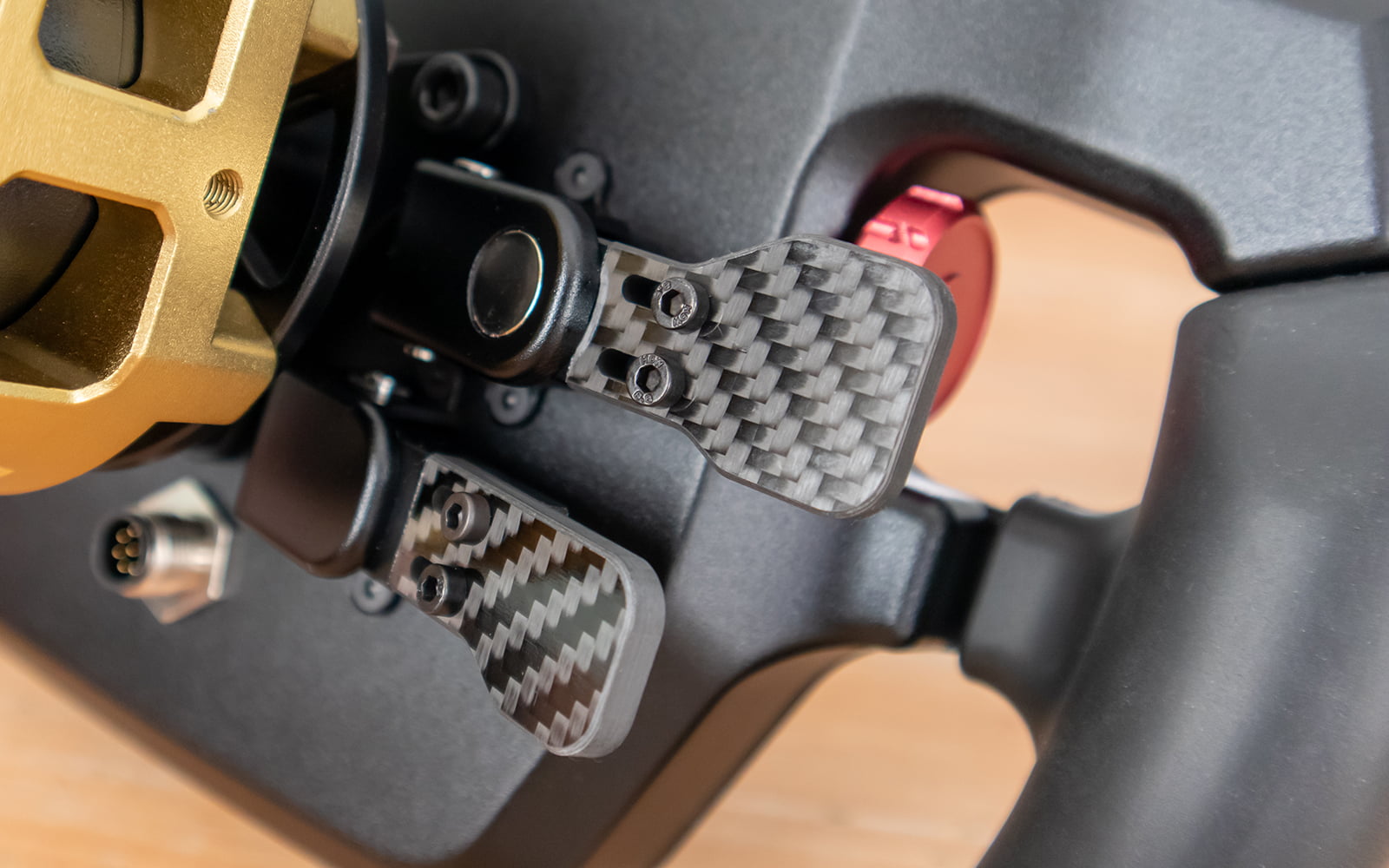 Een functionaliteit welke je het meeste gebruikt tijdens het racen zijn de shifters. Gemiddeld schakel je 48x per ronde dus deze moeten wel comfortabel aanvoelen. De shifters van de P1Sim Eau Rouge voelen goed aan, zijn niet te zwaar, maken niet veel lawaai en hebben een prima feedback. Wij vinden de travel wel iets aan de lange kant, dit is ongeveer 6mm waardoor het snel kunnen schakelen lastiger maakt. Juist op een Formule 1 stuurwiel is een korte travel van 2 à 3mm gewenst om snel te kunnen schakelen. De paddles zijn verder goed gepositioneerd op het stuurwiel en zijn alleen verstelbaar in de breedte. Doordat ze zo goed gepositioneerd zijn vinden wij verdere opties om te verstellen geen gemis.