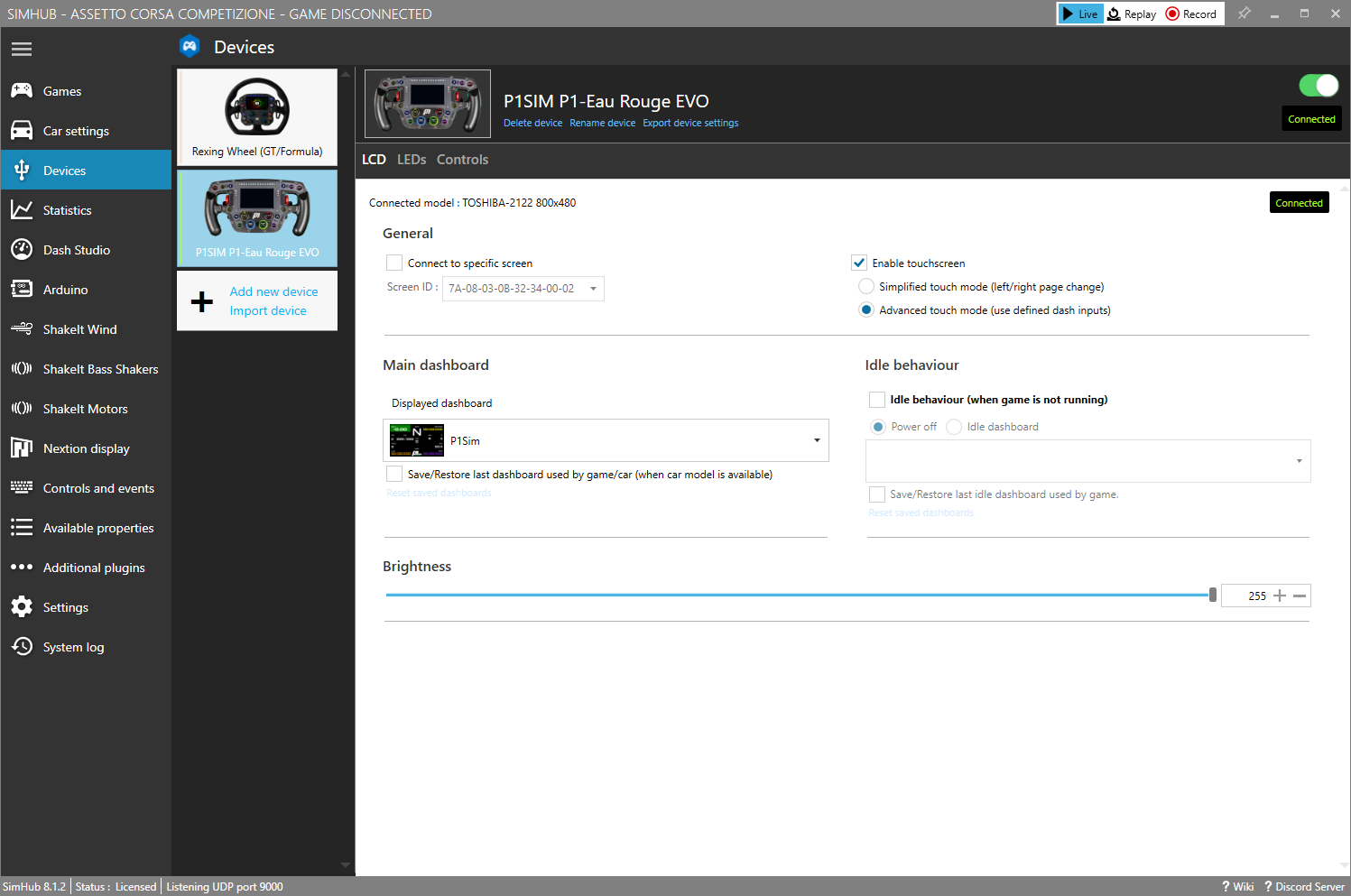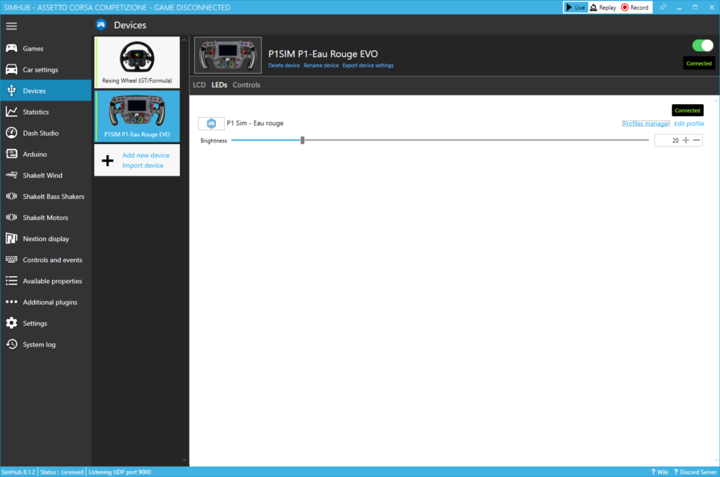 Voordat we kunnen gaan racen moeten we eerst nog het een en andere configureren. Wij hebben reeds de laatste versie Simhub geïnstalleerd, hierdoor wordt het stuurwiel direct herkend in Simhub en is het display op het P1Sim Eau Rouge stuurwiel direct operationeel. Zowel de dashboards voor het display als de LED-profielen zijn aanwezig in het stuurwiel en werken bij ons vrijwel direct. Het stuurwiel laat door middel van een blauw brandende LED zien of het het juiste LED-profiel is geladen. De enige instelling die we zelf moeten doen is het juiste dashboard selecteren voor het Vocore LCD-scherm. Mocht het na al deze stappen niet op een correcte manier werken dan heeft P1Sim een hele duidelijke handleiding op hun website staan waarin dit stap voor stap, met tekst en begeleidende afbeeldingen, wordt uitgelegd.