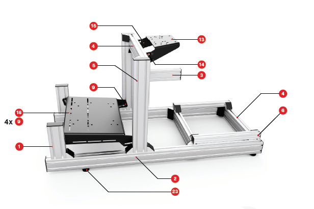 Samengevat: vervang de profielen (1) voor 30cm profielen en vervang de profielen (5) voor 40×120 profielen. Je bent daardoor veel flexibeler met je pedalplate (16) en de stuur kolom (4). Je creëert m.i. hiermee de perfecte simrig (GT1 Evo) waar je echt alle kanten (zelfs een F1 setup) mee uit kunt.