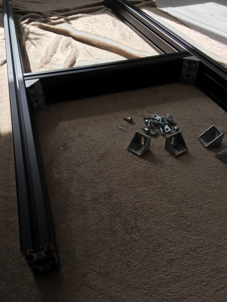 Hierna ga ik de brug monteren, waar de wheel base van het stuur op wordt gemonteerd. Met de 2 profielen van 580 mm en het resterende 480 mm profiel vorm je de brug op de grond. Dit is een van de gevallen waarin je de flapjes aan 1 kant van de hoekbeugels moet afbreken. Het gebruik van een grote schroevendraaier en een zeer lichte polsbeweging zorgt dat dit gemakkelijk gaat. Ik assembleer de brug op de basis met 4 hoekbeugels, en ik draai de bouten voldoende aan zodat het geheel stevig zit maar nog niet vast. Je zult de het frame later nog moeten afstellen.