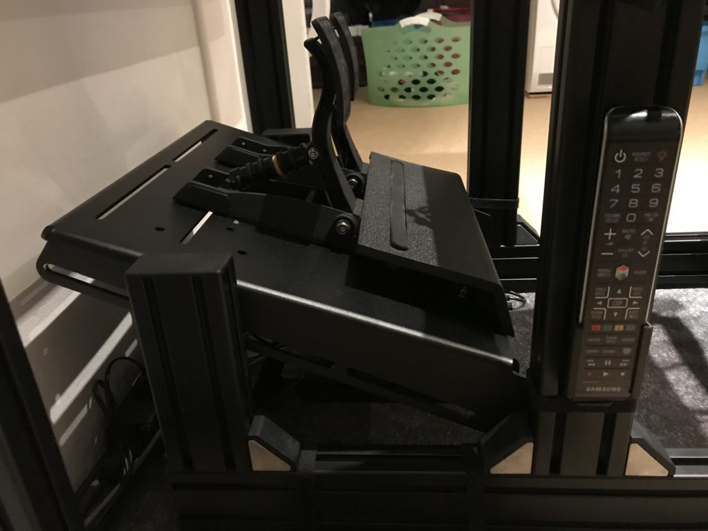 Doordat ik de stoel wat achterover heb hangen waan ik me in een kruising van een GT en F1 cockpit, en dit is precies het gene wat ik wilde bereiken. Ik zou zelf het stuur nog een paar cm naar me toe willen halen maar dit is voor nu niet haalbaar omdat ik aan de maximale afstand zit van de pedaalplaat en de afstand tussen stoel en pedalen perfect is. Ik heb hiervoor twee 300 mm profielen besteld bij Sim-Lab met de bijbehorende hoekbeugels. Deze profielen zullen op de plaats komen van de 195 mm profielen en de 195 mm profielen zullen de andere kant van de pedaalplaat gaan ondersteunen. Hierdoor komt de brug volledig los te staan en kan ik deze nog meer naar mij toe halen. Daarnaast zal ook de pedaalplaat heel iets omhoog kunnen zodat ik met mijn benen een hele kleine knik heb van de stoel naar pedalen toe.