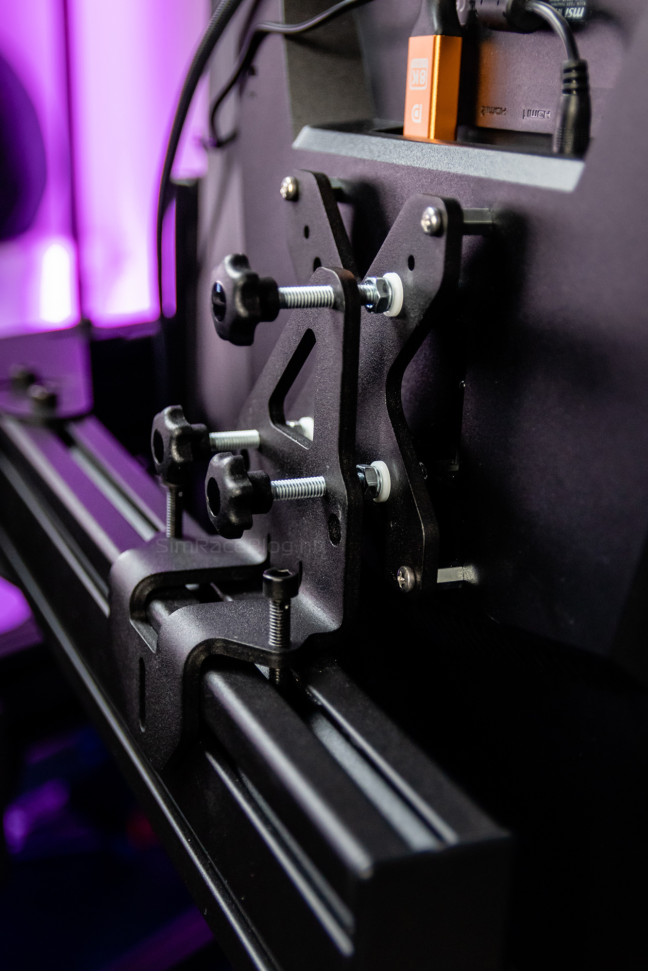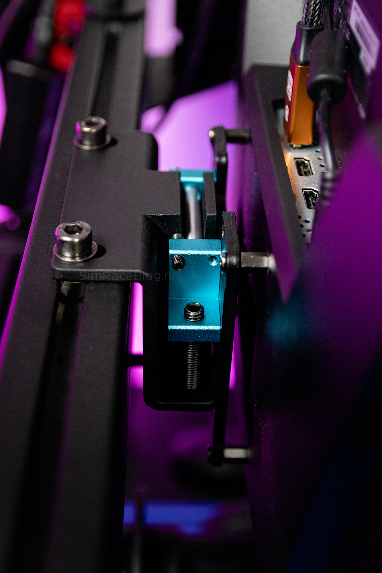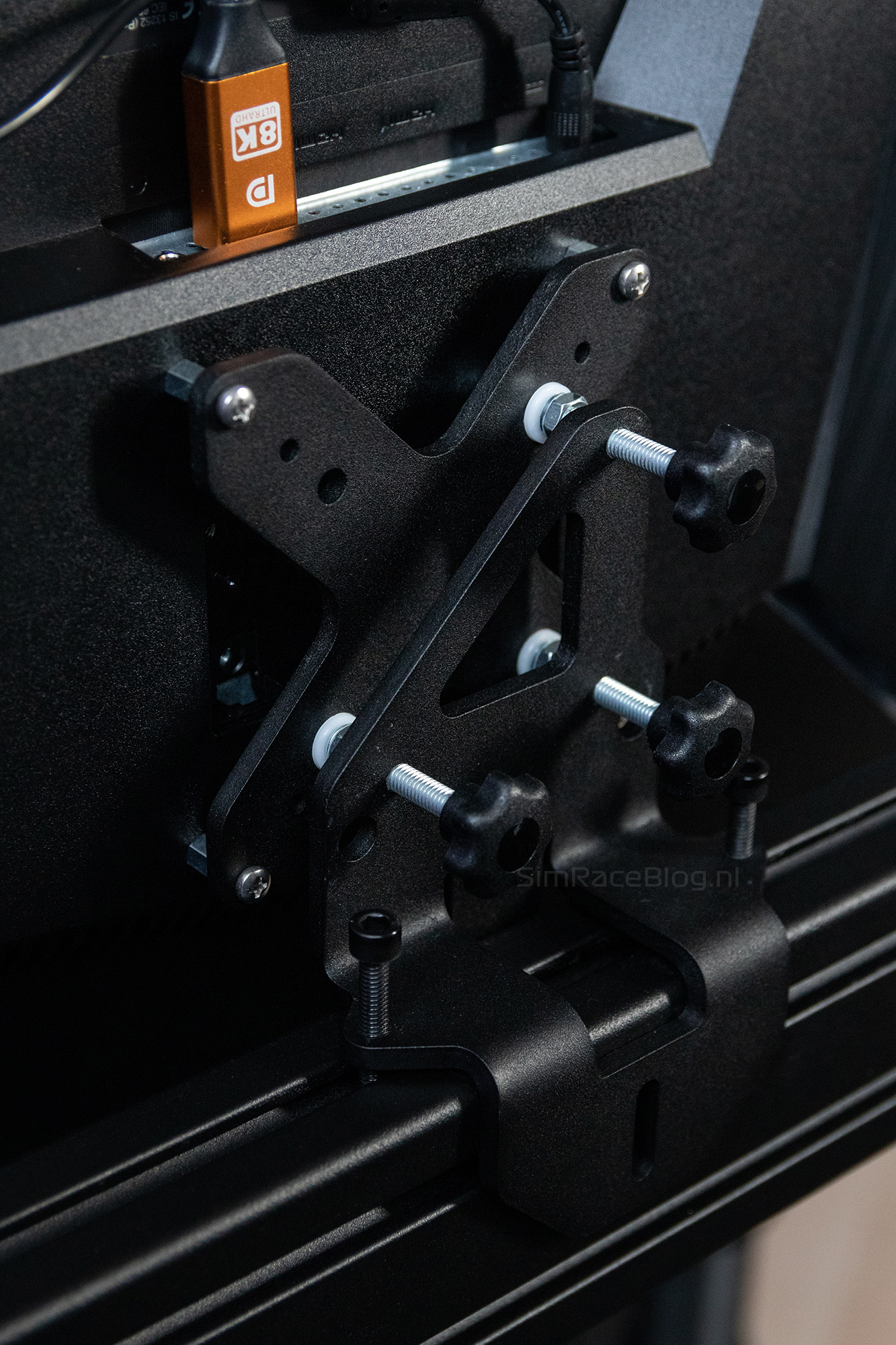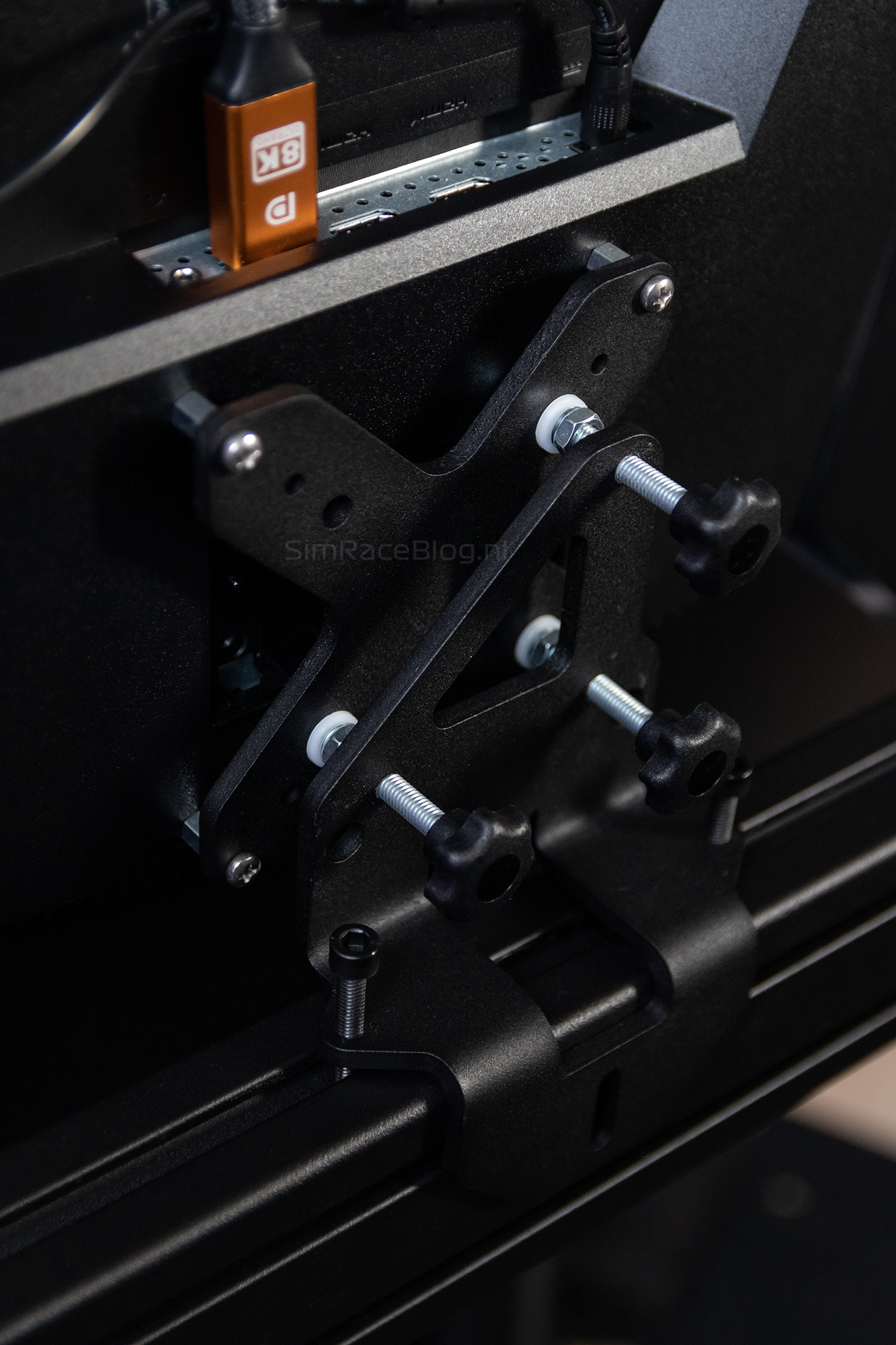 De TREQ Easy Alignment Kit wordt volledig gemonteerd aan de monitorzijde en vervolgens bovenop het aluminium profiel geplaatst. Dit werkt prima, maar heeft -in ons geval- een klein mogelijk nadeel. De aluminium profielen van TREQ, net als vele andere, zijn zwart geanodiseerd en precies 4 centimeter breed. De simrig waarop we de alignment kits monteren bestaat uit zwart poedergecoate profielen die ongeveer 0,3 mm dikker zijn. We kunnen de Easy Alignment Kit op dit profiel plaatsen, maar het gaat moeizaam en kost enige assertiviteit om deze erop te schuiven. Het zijwaarts verplaatsen van de beugel is zo niet langer mogelijk, terwijl de kit vrij kan bewegen op een geanodiseerd profiel zoals dat van TREQ. Voor ons brengt dit een risico met zich mee om het poedergecoate profiel te beschadigen. Doordat de monitor bovenop het aluminium profiel is gemonteerd in plaats van ervoor, betekent dit ook dat de monitorbevestiging in ons geval moet worden verlaagd.