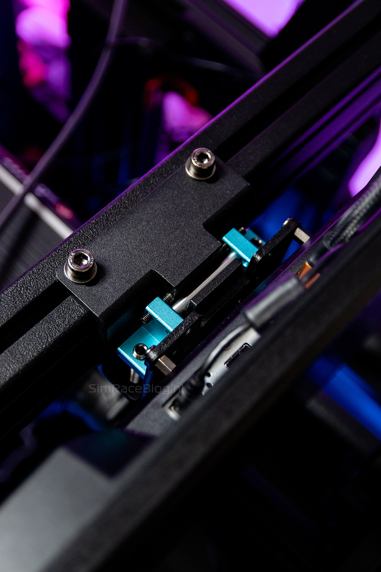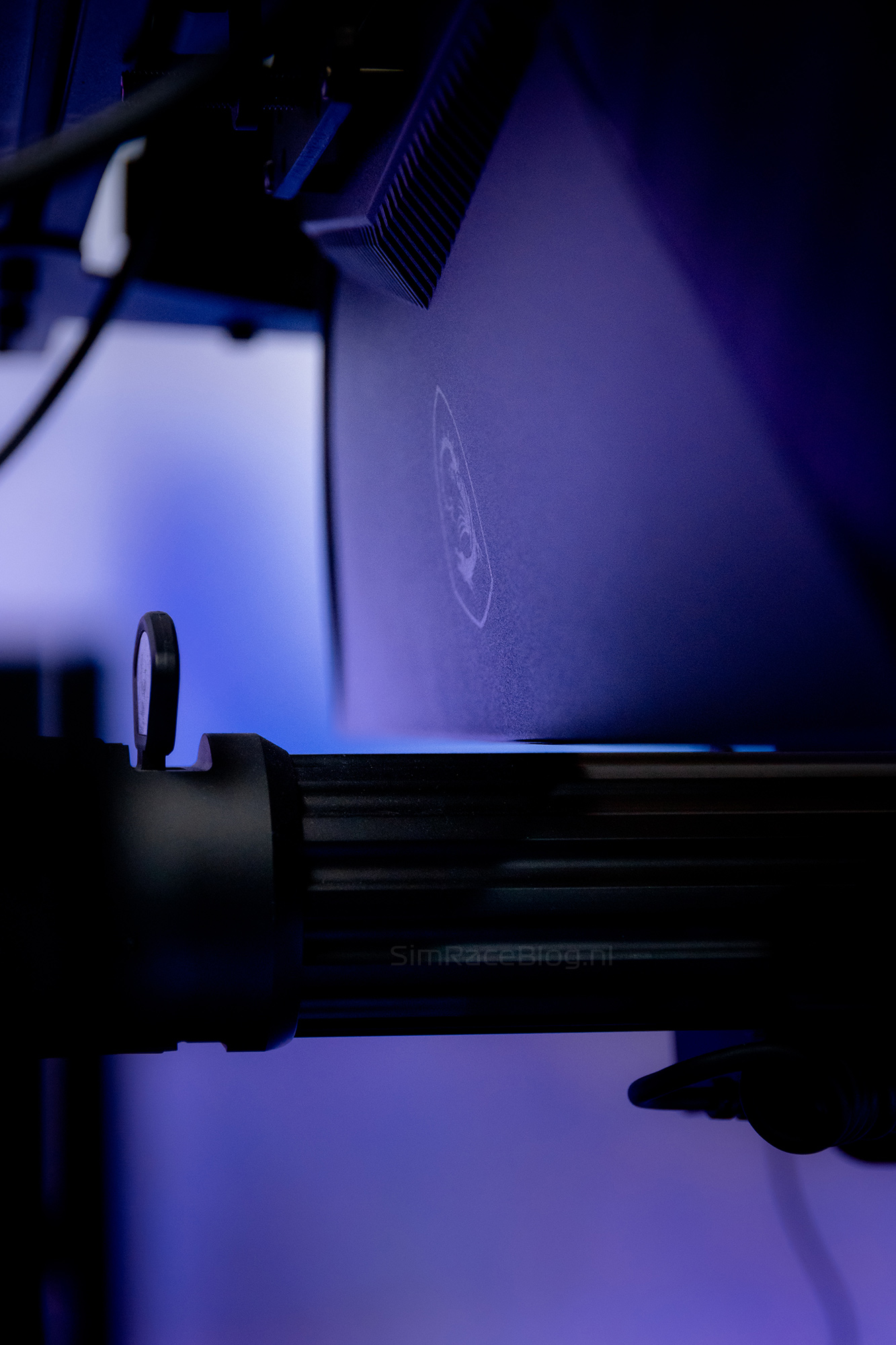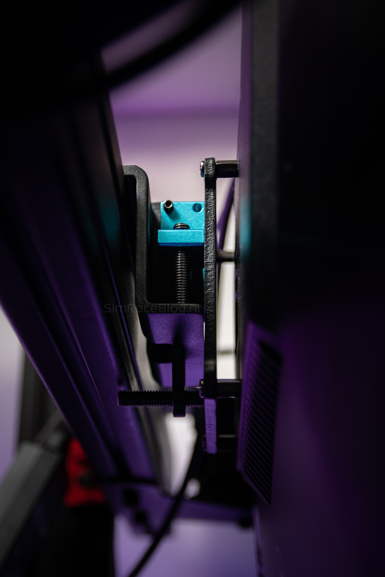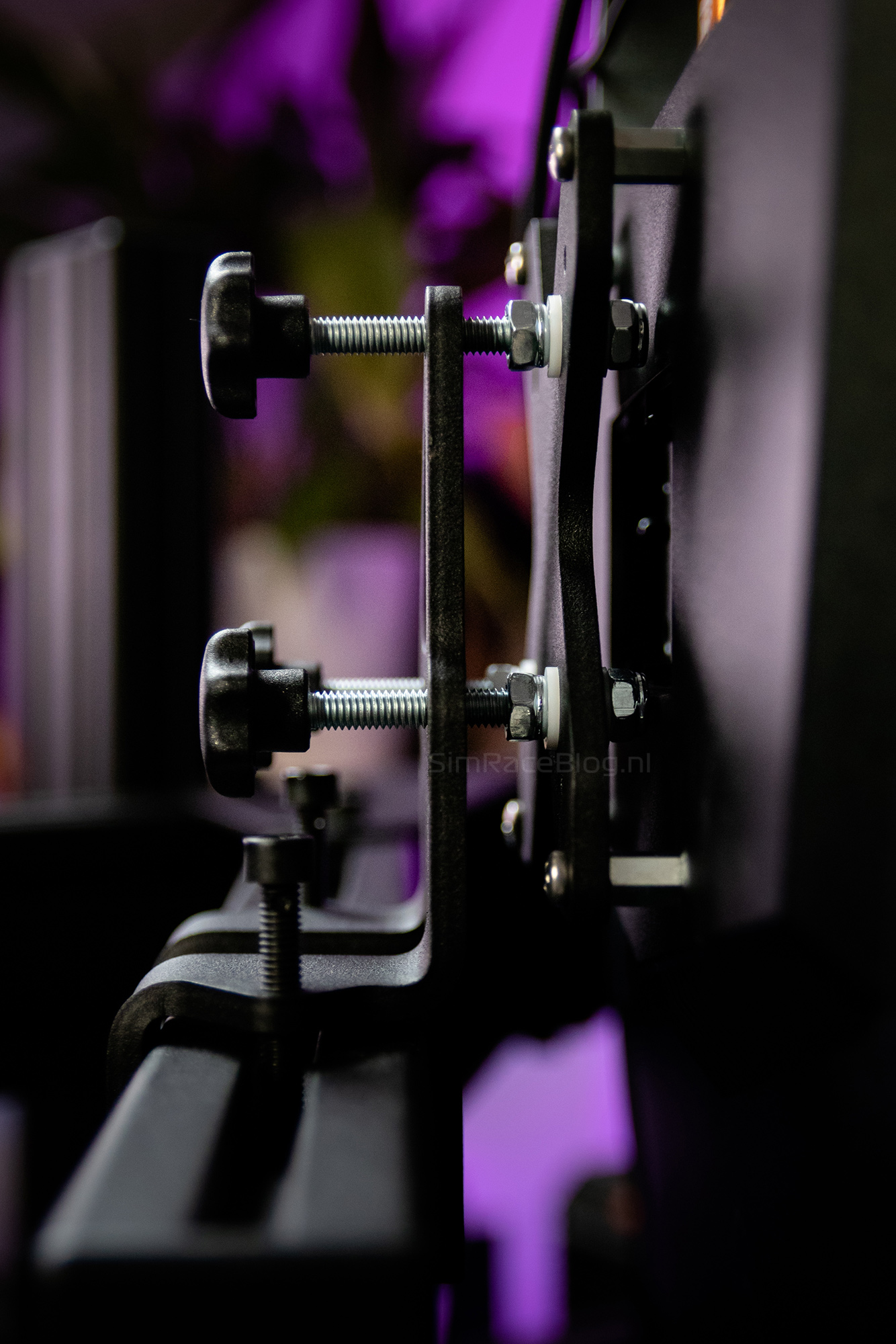 De TREQ Easy Alignment Kit wordt volledig gemonteerd aan de monitorzijde en vervolgens bovenop het aluminium profiel geplaatst. Dit werkt prima, maar heeft -in ons geval- een klein mogelijk nadeel. De aluminium profielen van TREQ, net als vele andere, zijn zwart geanodiseerd en precies 4 centimeter breed. De simrig waarop we de alignment kits monteren bestaat uit zwart poedergecoate profielen die ongeveer 0,3 mm dikker zijn. We kunnen de Easy Alignment Kit op dit profiel plaatsen, maar het gaat moeizaam en kost enige assertiviteit om deze erop te schuiven. Het zijwaarts verplaatsen van de beugel is zo niet langer mogelijk, terwijl de kit vrij kan bewegen op een geanodiseerd profiel zoals dat van TREQ. Voor ons brengt dit een risico met zich mee om het poedergecoate profiel te beschadigen. Doordat de monitor bovenop het aluminium profiel is gemonteerd in plaats van ervoor, betekent dit ook dat de monitorbevestiging in ons geval moet worden verlaagd.