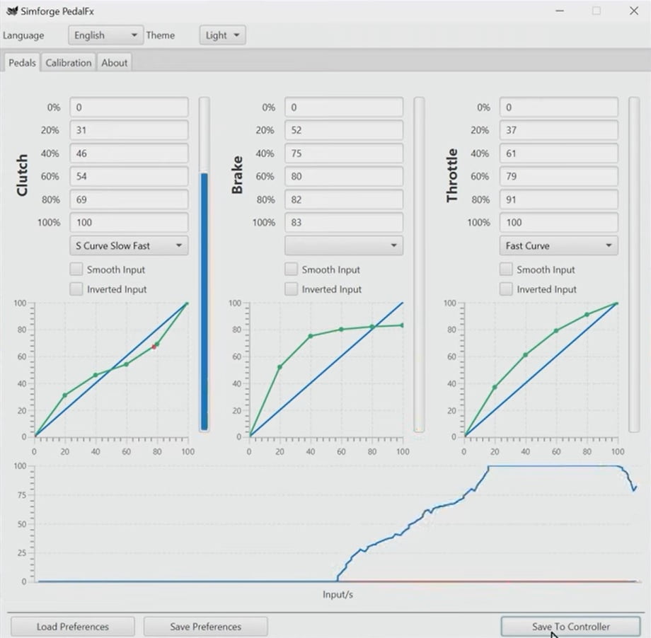 De software zelf is een relatief simpele software zonder visuele tierelantijn en doet precies wat het doen moet. Waar de software wel uitgebreid in is dat is de keuze in talen. De software heeft de mogelijkheid om in 9 verschillende talen ingesteld te worden. De software heeft twee interessante tabbladen die gebruikt worden voor het kalibreren van de pedalen. In het eerste tabblad genaamd “pedals” kan je de huidige pedaalinput bekijken en ook de lineairiteit van je pedaalinput aanpassen. Hierbij heb je de keuze uit een aantal standaard presets of kan je ieder punt zelf een specifieke waarde meegeven. Het tweede tabblad “Calibration” is het tabblad waarop je de daadwerkelijke kalibratie uitvoert. Het tabblad lijkt door alle weergegeven informatie wat complex, echter is het kalibreren van de Simforge Mark-1 pedalen letterlijk zo simpel als op start drukken, je pedaal een keer helemaal indrukken en loslaten en tweemaal op next klikken. Onderin nog even je kalibratie opslaan en klaar! De ruwe minimum en maximum waardes van het pedaal worden dan respectievelijk weergegeven onder de blauwe en rode strepen. Daar waar de dikke balk de huidige input van het pedaal weergeeft met gekleurde strepen waar de kalibratiewaardes staan, kan je in de 2e balk die er onder staat je onderste en bovenste deadzone instellen door de bolletjes naar links of rechts te slepen. De waardes van de deadzone zijn dat weer af te lezen onder de groene en gele streep en worden ook met een streepje in de 1e balk weergegeven.