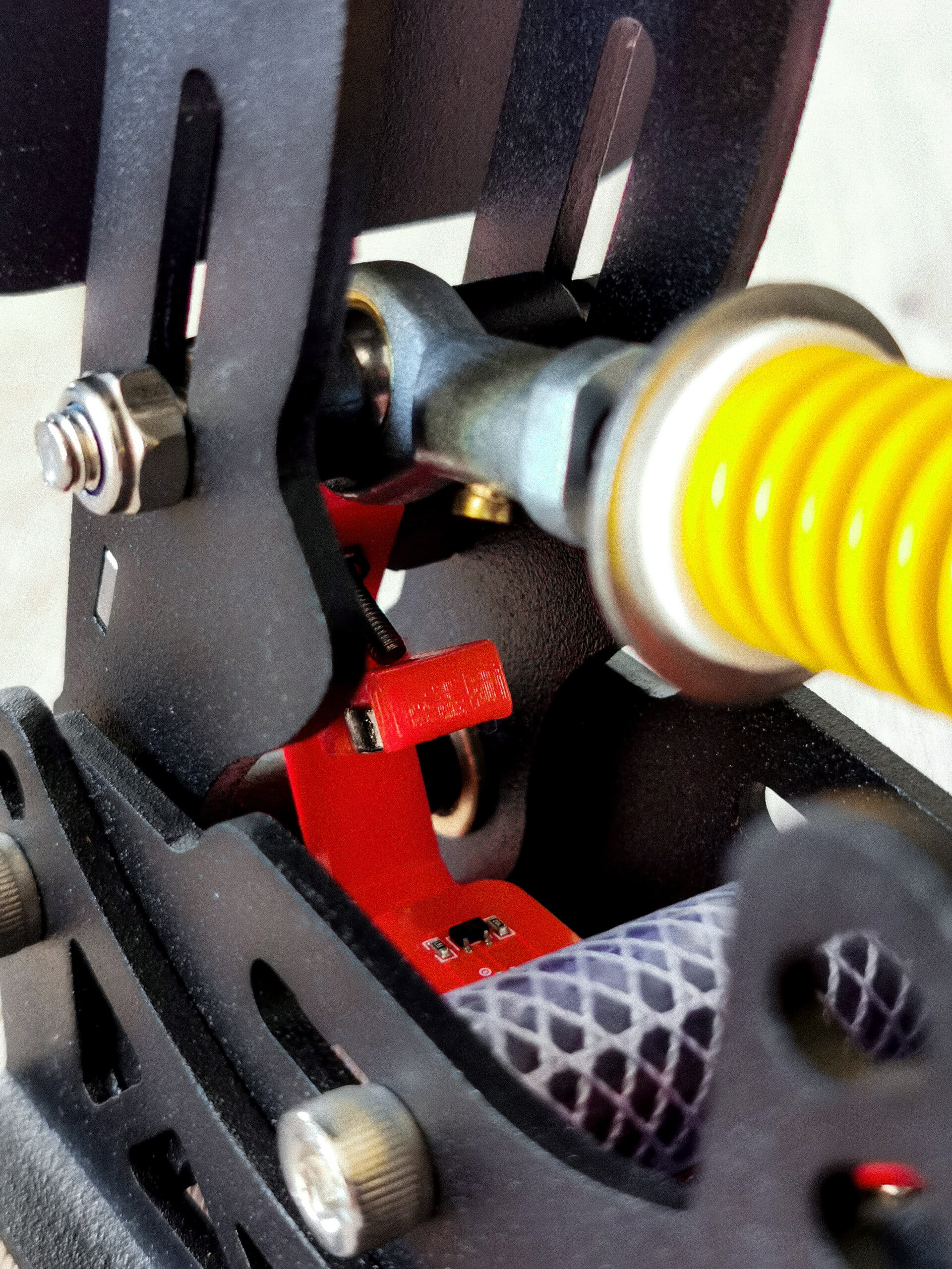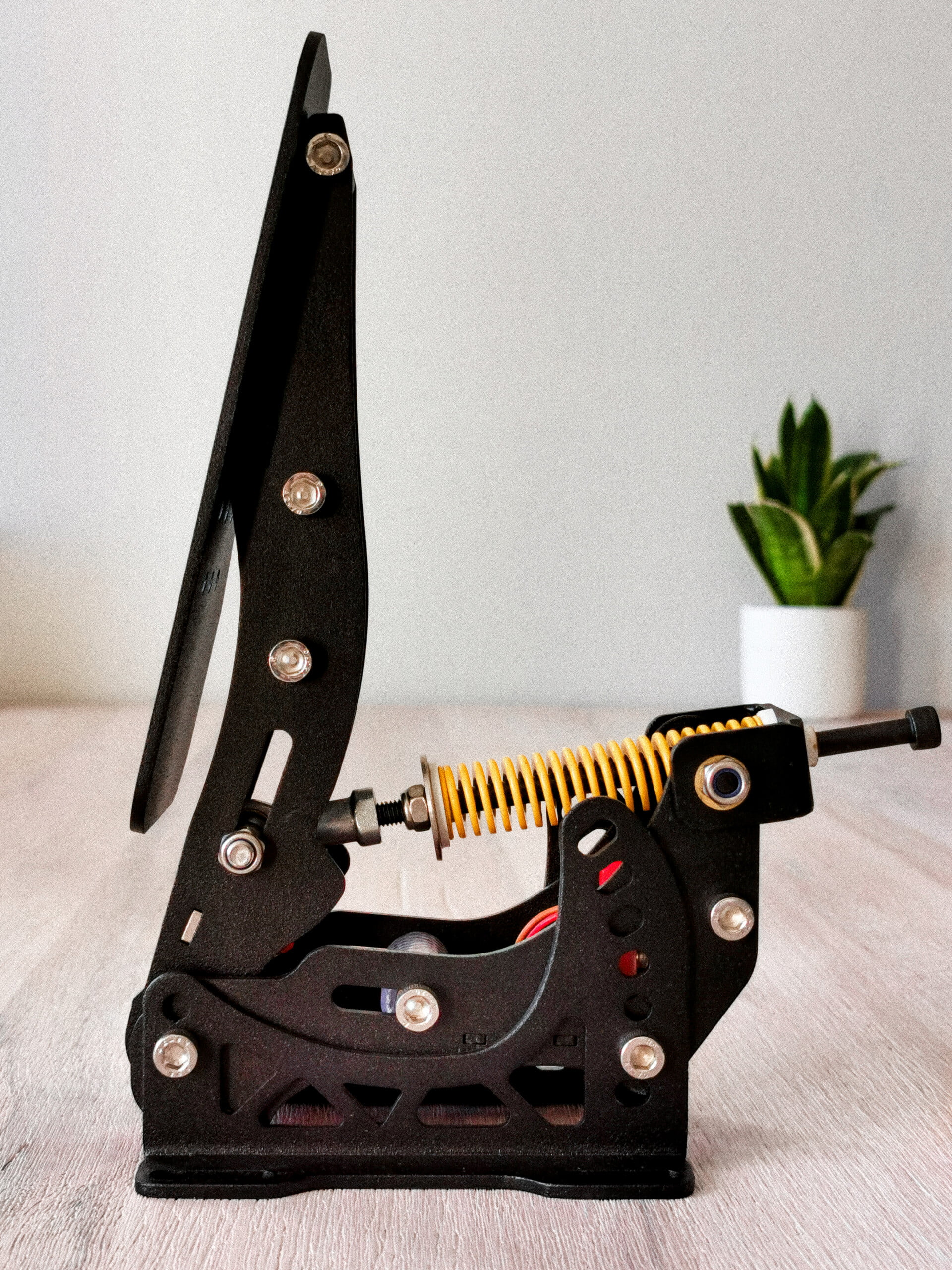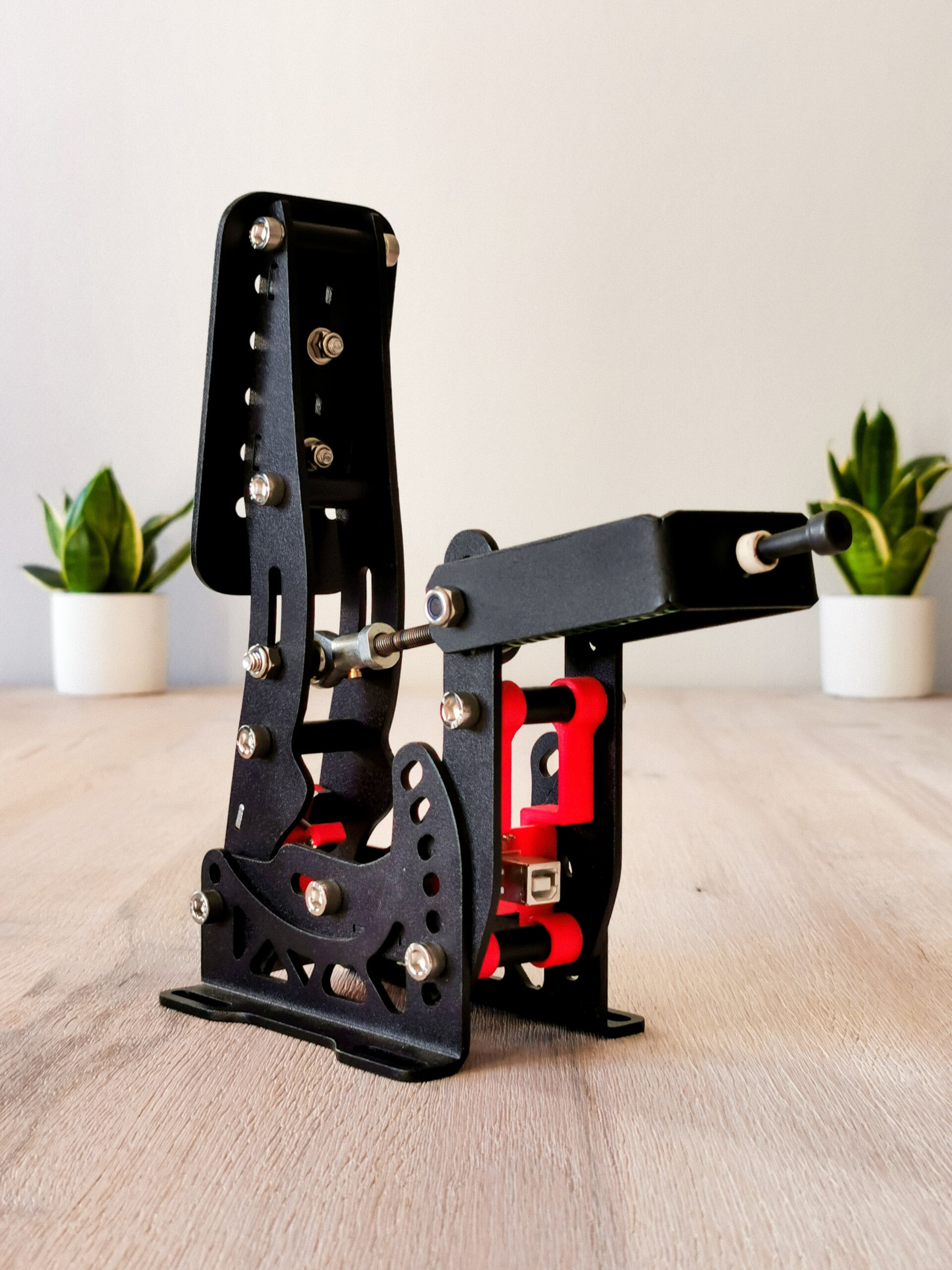 Het koppelingspedaal is wel weer een pedaal waarop wij de rode 3D-geprinte delen verwerkt zien tussen het mooie zwart gecoate aluminium. De voetplaat van dit pedaal heeft een standaard rechthoekige vorm die we ook vaak terugzien op andere pedalen en heeft een 3×5 gatenpatroon. Evenals bij het gaspedaal wordt er in het koppelingspedaal gebruik gemaakt van een Hall-sensor om de pedaalstand met een nauwkeurigheid van 10-bit door te geven aan de computer. Uiteraard verschilt het koppelingspedaal zelf natuurlijk wel ten opzichte van het gaspedaal. Zo is dit pedaal voorzien van een tuimelsysteem om het aangrijppunt van de koppeling te simuleren. Hierbij verandert de lineaire veer van dit pedaal van hoek naar mate je het pedaal indrukt, het gevolg hiervan is dat de kracht van de veer niet lineair op je pedaal werkt waardoor je het pedaal “door” het aangrijppunt van de koppeling heen kan drukken. Om het pedaal naar eigen voorkeur af te kunnen stellen is ook dit pedaal voorzien van alle mogelijkheden om hoek, voorspanning van de veer en de slag van het pedaal te kunnen veranderen.