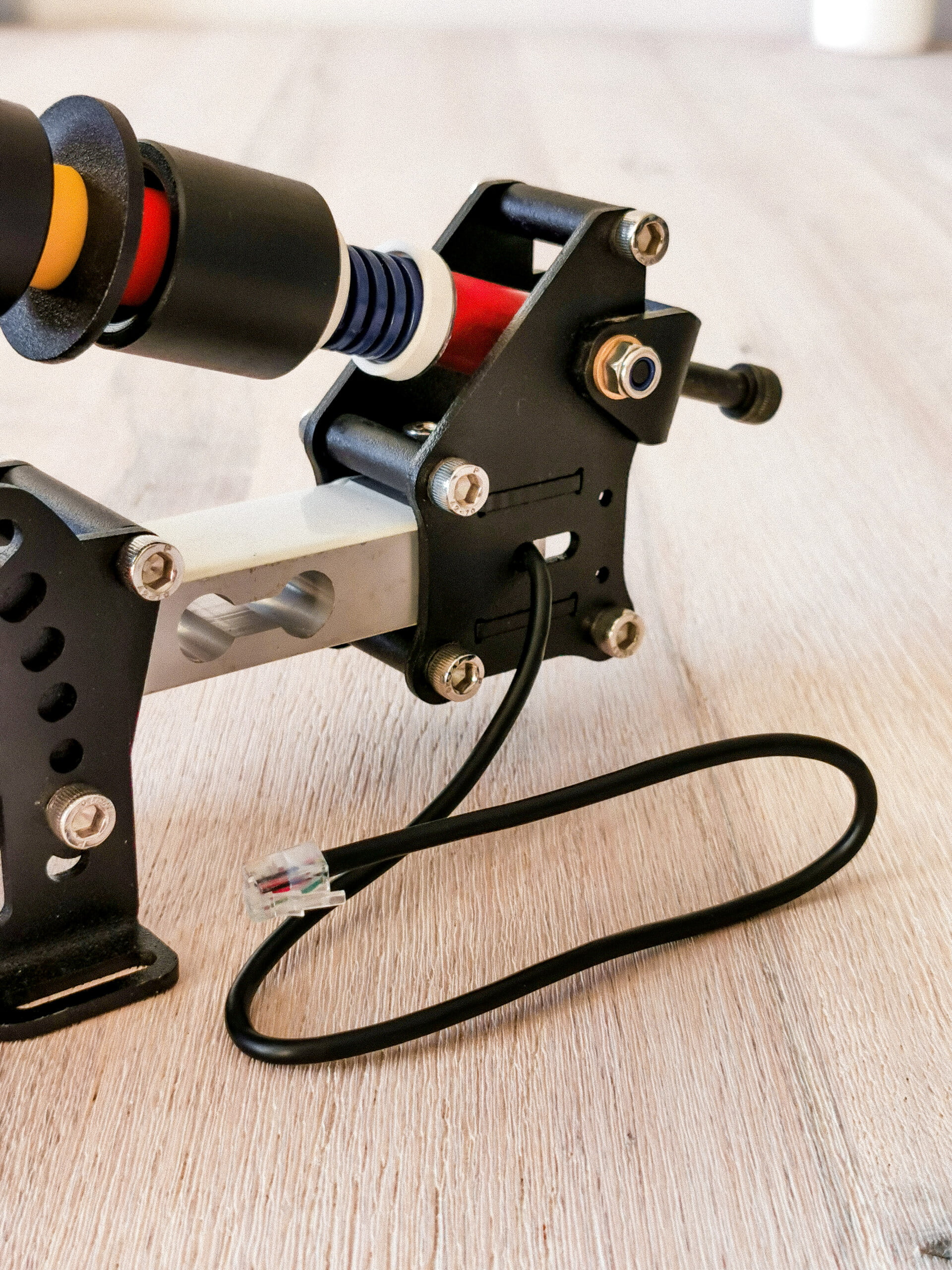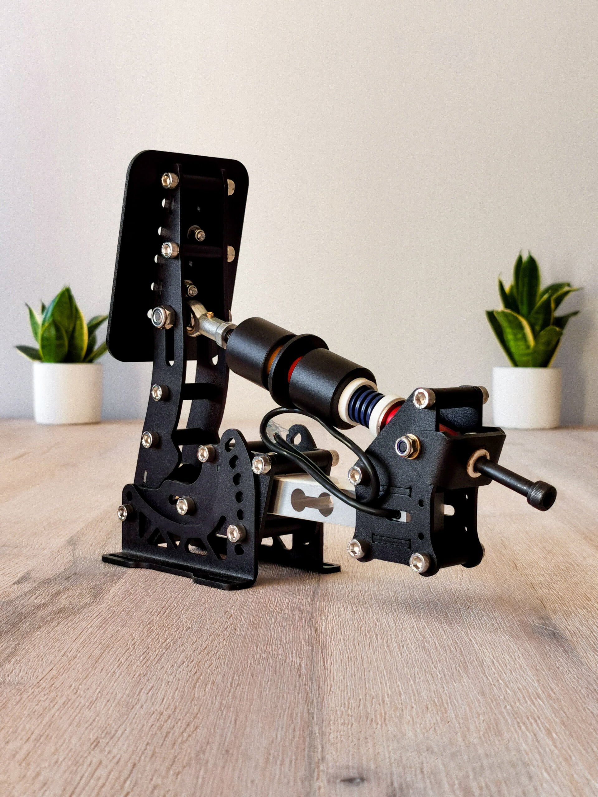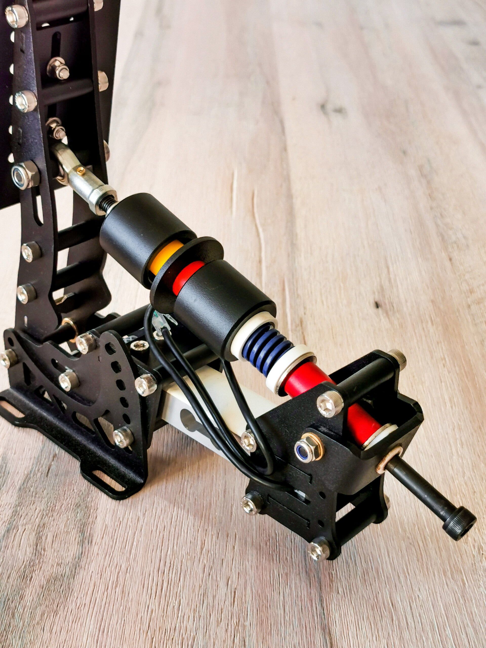 Het koppelingspedaal is wel weer een pedaal waarop wij de rode 3D-geprinte delen verwerkt zien tussen het mooie zwart gecoate aluminium. De voetplaat van dit pedaal heeft een standaard rechthoekige vorm die we ook vaak terugzien op andere pedalen en heeft een 3×5 gatenpatroon. Evenals bij het gaspedaal wordt er in het koppelingspedaal gebruik gemaakt van een Hall-sensor om de pedaalstand met een nauwkeurigheid van 10-bit door te geven aan de computer. Uiteraard verschilt het koppelingspedaal zelf natuurlijk wel ten opzichte van het gaspedaal. Zo is dit pedaal voorzien van een tuimelsysteem om het aangrijppunt van de koppeling te simuleren. Hierbij verandert de lineaire veer van dit pedaal van hoek naar mate je het pedaal indrukt, het gevolg hiervan is dat de kracht van de veer niet lineair op je pedaal werkt waardoor je het pedaal “door” het aangrijppunt van de koppeling heen kan drukken. Om het pedaal naar eigen voorkeur af te kunnen stellen is ook dit pedaal voorzien van alle mogelijkheden om hoek, voorspanning van de veer en de slag van het pedaal te kunnen veranderen.