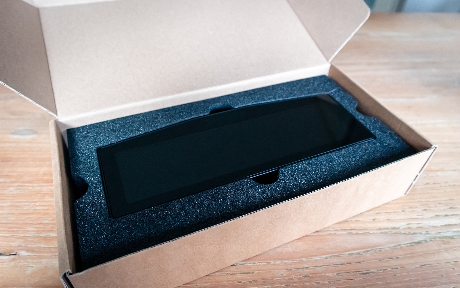 Bij het openen van de productdoos zien we een zwarte schuimlaag als bescherming. Zodra we de eerste laag optillen, vinden we in de tweede laag het DDUXX1 Sim Dashboard netjes ingepast in een uitsparing in de schuimlaag. Onder deze laag ligt nog een zwarte schuimlaag, waarin een USB-kabel, een Mini-HDMI naar HDMI-kabel, een zakje met de benodigde schroeven en een zakje met de carbon montagebeugels zijn opgeborgen. Al met al een compleet pakket waarmee we direct aan de slag kunnen.