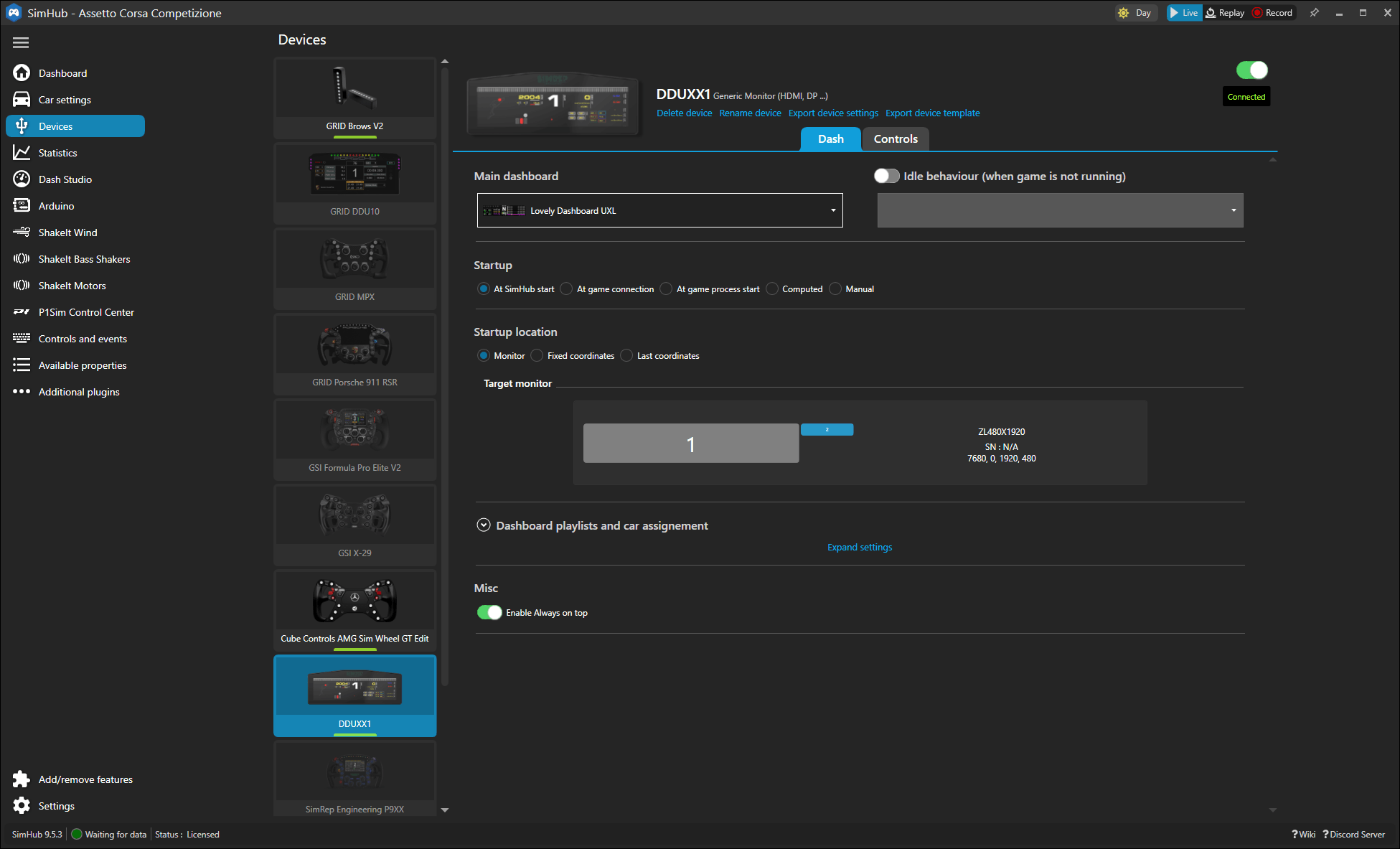 Nu hoeven we alleen nog een dashboard-template te downloaden. SimRep Engineering heeft een eigen versie beschikbaar op de website, en daarnaast maakt Lovely Sim-Racing ook dashboards voor SimRep Engineering. Hun versie kun je hier downloaden. Wij kiezen voor de Lovely-variant, die er net wat fraaier uitziet en extra functionaliteiten biedt. Na het downloaden importeren we het dashboard-template in SimHub en selecteren het als ‘main dashboard’. Het gedownloade dashboard-template verschijnt nu op de DDUXX1, die daarmee helemaal klaar is voor gebruik.