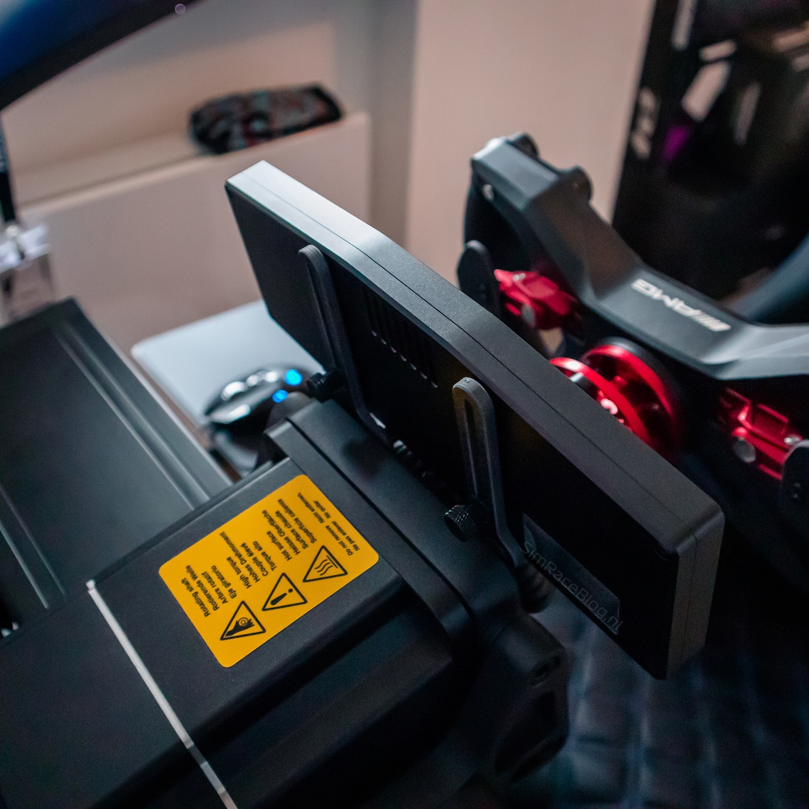 We beginnen met het monteren van de meegeleverde carbon montagebeugels aan de achterkant van het scherm. Dit doen we met de bijgeleverde boutjes en nylon ringetjes. Eerst plaatsen we een ringetje om het boutje, steken het vervolgens door de montagebeugel(s), en gebruiken daarna nog een ringetje voordat we het geheel achter op het display vastschroeven. Zodra de montagebeugels op het display zijn bevestigd, kunnen we het geheel op onze Simucube-wheelbase monteren. Vervolgens sluiten we de USB- en HDMI-kabel aan op het display en verbinden deze met onze PC. Nog even de kabels netjes wegwerken, en dan zijn we klaar om de DDUXX1 te configureren in SimHub.