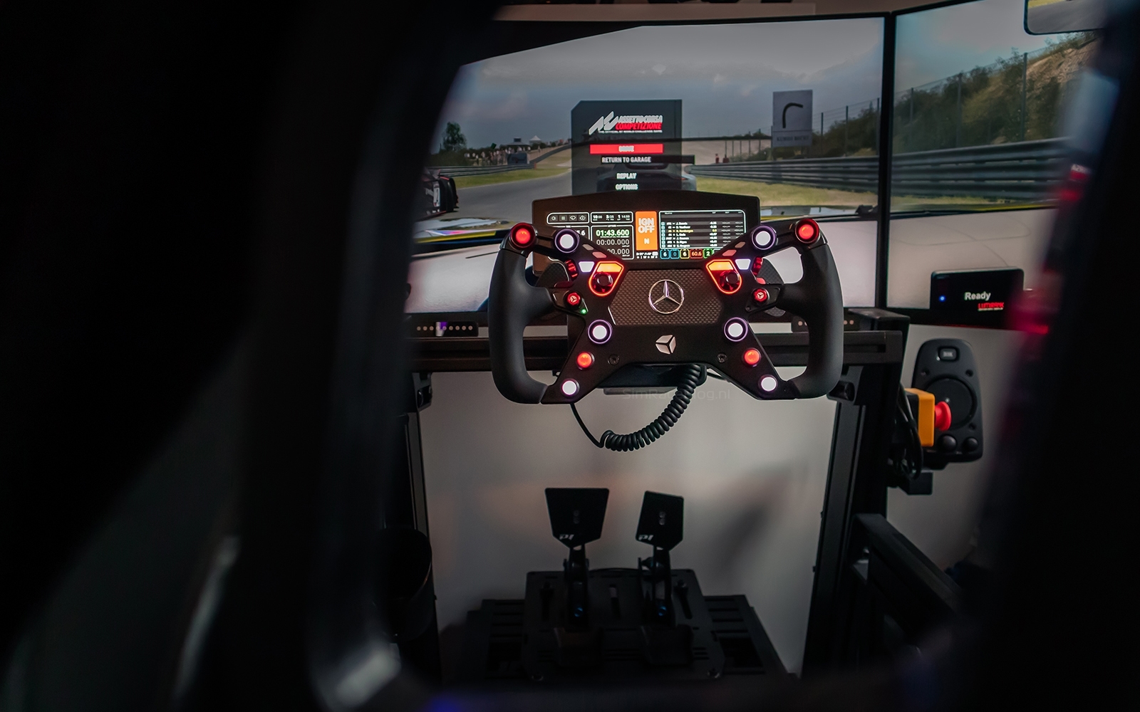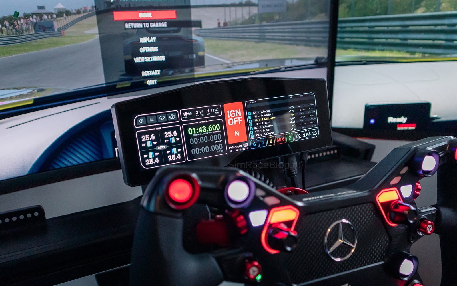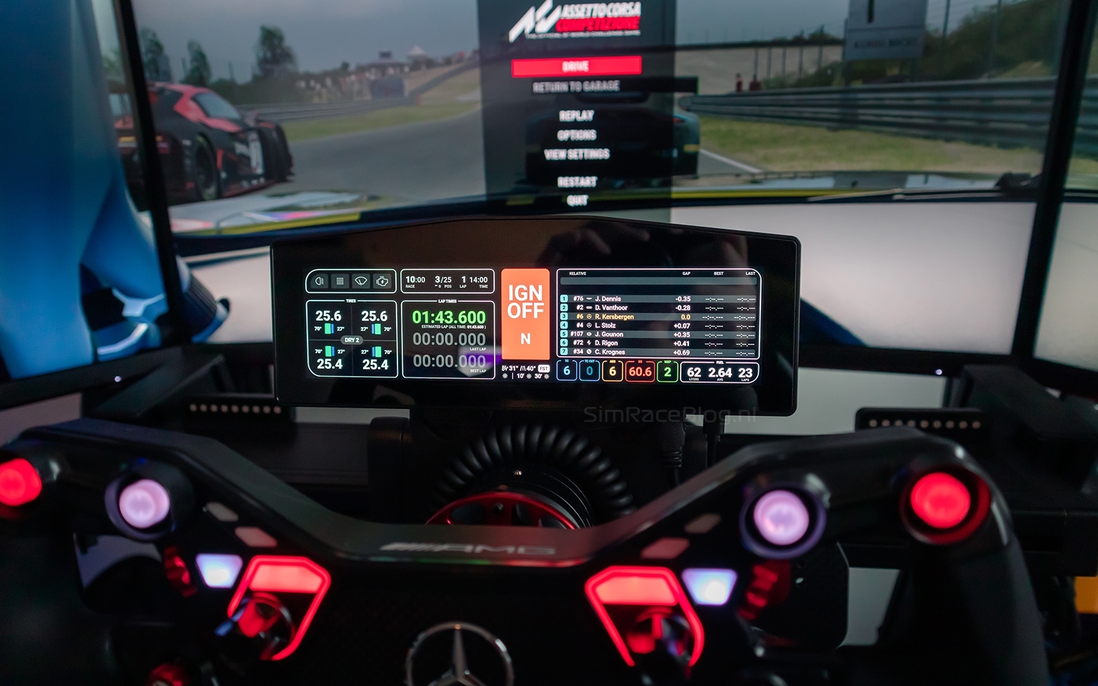 We gaan rijden in de Mercedes AMG GT in Assetto Corsa Competizione, gecombineerd met het Cube Controls Mercedes-AMG GT Edition Stuurwiel (review volgt). Deze setup is volgens ons perfect om het dashdisplay van de DDUXX1 grondig te testen. Onze eerste indruk is meteen positief. Met een scherm van 8,8 inch (1920×480 pixels) heeft de DDUXX1 een bijzonder formaat. Dit maakt het mogelijk om het scherm precies in ons gezichtsveld te plaatsen, net binnen de virtuele cockpit van de Mercedes AMG GT, zonder dat het storend is. We waren even bang dat de DDUXX1 misschien te laag zou zijn, maar in de praktijk is het juist prettig en goed afleesbaar tijdens het racen, vooral in combinatie met een stuur van formaat zoals de Cube Controls Mercedes-AMG GT Edition.